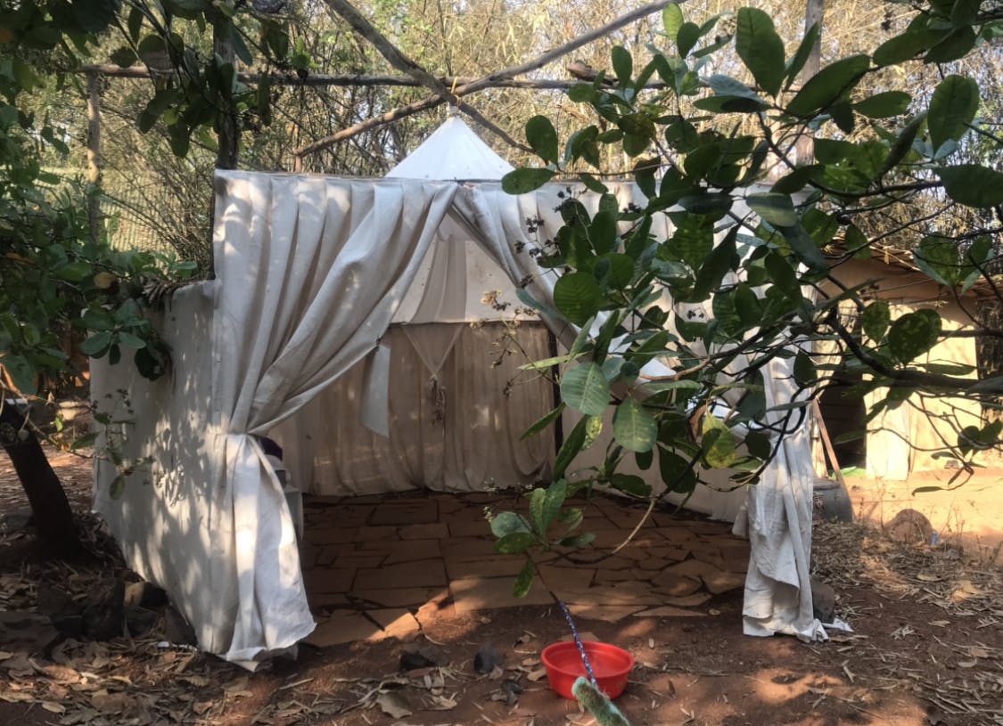 今は、どの小屋も満室で価格も高騰。そんな中、オーナーが私のためにこのテントを立ててくださいまして、今はこのテントで、マットを敷いて、セラピーを行なっています。
