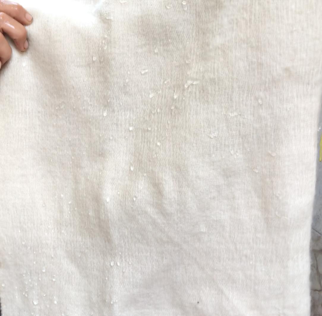 その分、カシミヤなどの高級素材よりも安価で今回ご紹介したような撥水効果など、面白い素材です。肌触りが気になる方には、プロジェクト本文でも触れましたように、柔軟剤やお酢、ヘアトリートメントの使用などで、ソフトに仕上げてのご使用をお勧めいたしております。