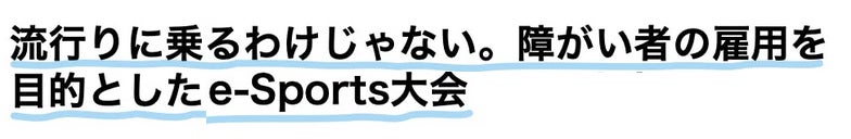 ※先般、当ページ内で「日本初障がい者の雇用支援を目的としたe-Sports大会」との文言の前に「日本初」との記載をしておりましたが、障がい者のe-Sports大会は日本初の開催ではございません。障がい者の雇用を目的とする大会が日本初である旨を意図した記載でございましたが、一部、誤解を招きましたことに鑑み、「日本初」の記載は削除させて頂きました。