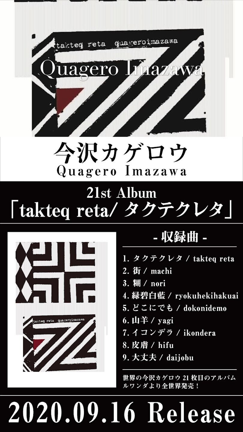みなさん お元気ですか?『タクテクレタ』無事に届いておりますでしょうか?無事に聴けておりますでしょうか?実は本日 9月16日(水)が今沢カゲロウ21枚目のCD『takteq reta/ タクテクレタ』本日公式リリース日です!本日からようやく全国のCDショップに並びアマゾン等での通販も可能になります。ご縁をいただき 本日から1ヵ月間全国のパルコ、ロフト、イオンモール、ららぽーと、フォーラス、ビブレ、オーパ等 に135の支店がある島村楽器さんにて: ・店頭ではデジタルサイネージ(毎時間配信): 『タクテクレタ』トレイラー動画 (トップ写真:店頭の静止画) ・店内では番組放送(8分32秒): 21stアルバム『タクテクレタ』よりタイトル曲、 シングル『セル・カイ』(ナビゲートは今沢カゲロウ本人) が流れます。こんな尖った曲がヘビーローテーションになるのと アフリカ・ルワンダの幾何学模様の伝統工芸を模したジャケデザインが全国各地のごく一般のファミリー層が集うパルコ、イオン、ロフトなどのテナント店頭に1ヵ月間も出るのが少々不思議かつ非常に愉快です。島村楽器さんは2009年3月からの全国100店舗以上でのライヴ&セミナー 2010年から5年間ほどのヒストリーブランドのベースの開発協力 2018年の全国135店舗の店頭ポスター 2019年はムーンギターズの私のPB-4の販売でもお世話になっています。 アルバムに関してのメディア報道なども今後は不定期にありますのであらためて報告させて頂きます。それから今後 ZOOMにてパトロンの皆さんで集う『タクテクレタ』感想や今後の活動についてのオフ会も開催予定です。こちらも改めてご連絡します。皆さんのお力で ようやく一般発売まで来れました。コロナ禍以降にポストプロダクションの時間がさらに長くなったり19年来 行動を共にしたエンジニアの方が 今作を最後に引退されたり人知れずの悲喜こもごものドラマもあったレコーディングでしたがすでに多方面から冥利に尽きる感想も届いていて日々勇気を頂きながら活動できております。「ミュージシャンはこれからどうなってしまうのか?」ということが日々の話題になってしまいがちなコロナ禍ではありますがこのアルバム『タクテクレタ』を今日以降しっかりと 聴きたい人々に 可能な限り 届け続けていきます!ここまで 共に歩いていただきありがとうございました!『タクテクレタ』を届ける旅は ここからが本番でますます長く続きます引き続き応援よろしくお願いいたします!今沢カゲロウhttp://bassninja.net/ もっと見る