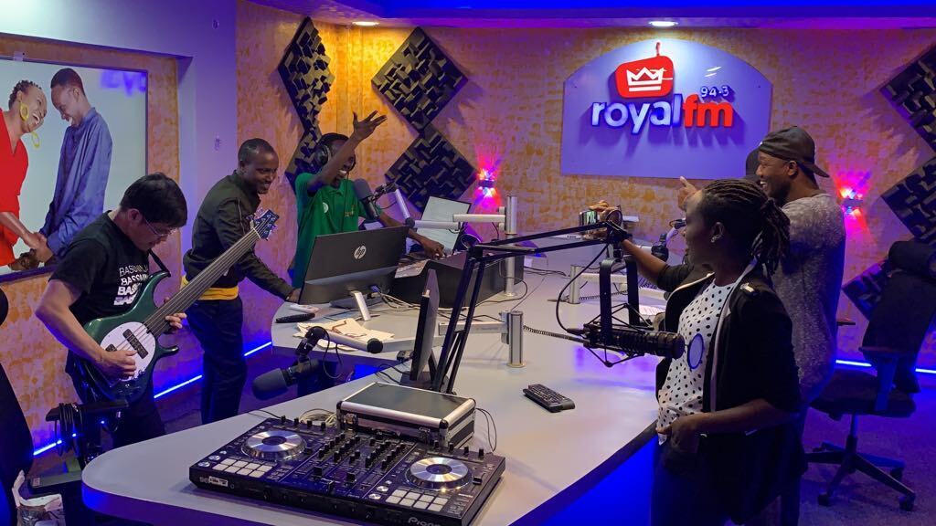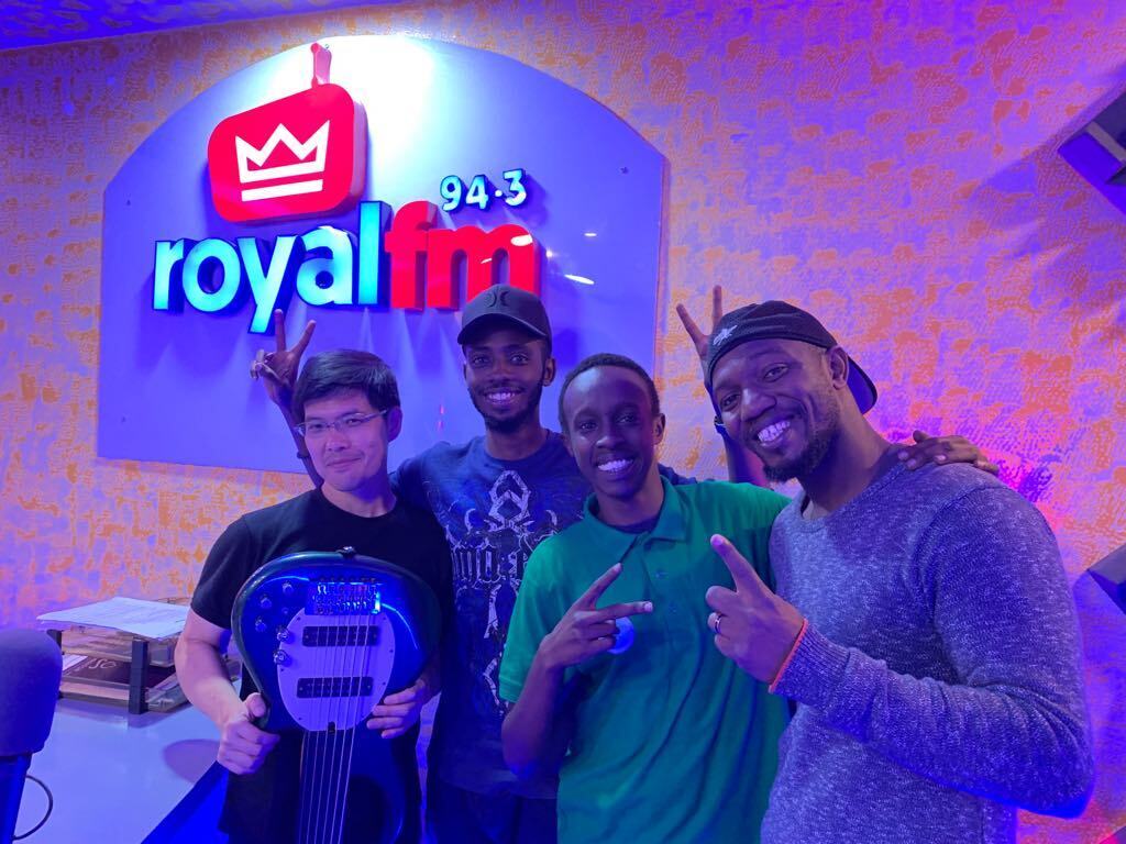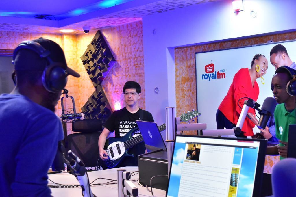 ルワンダに来た理由、ベーシストとしての経歴、これからどうやってルワンダの音楽とコラボレーションしていきたいか等の質問が飛ぶ。その都度巨大なリアクション。