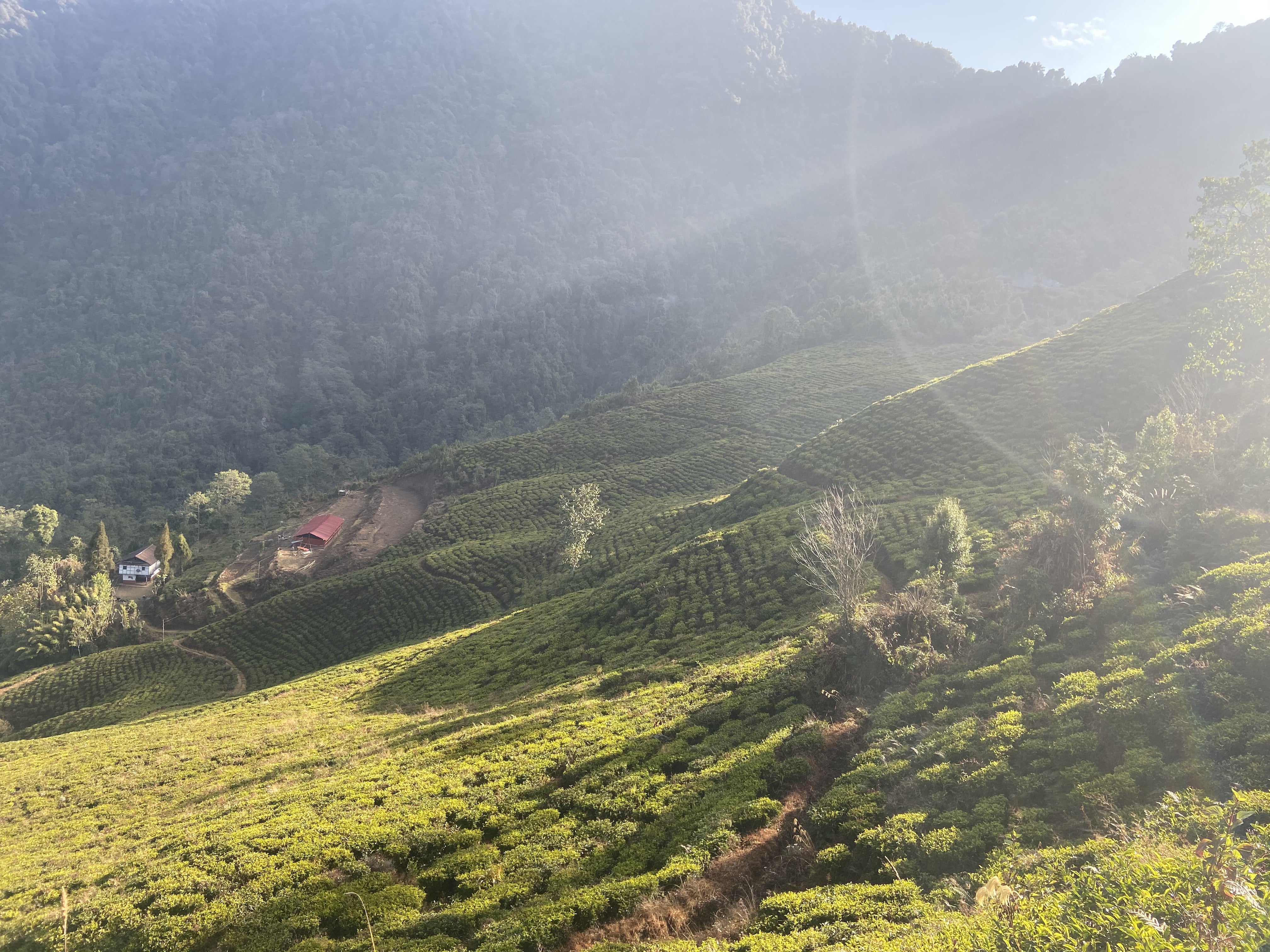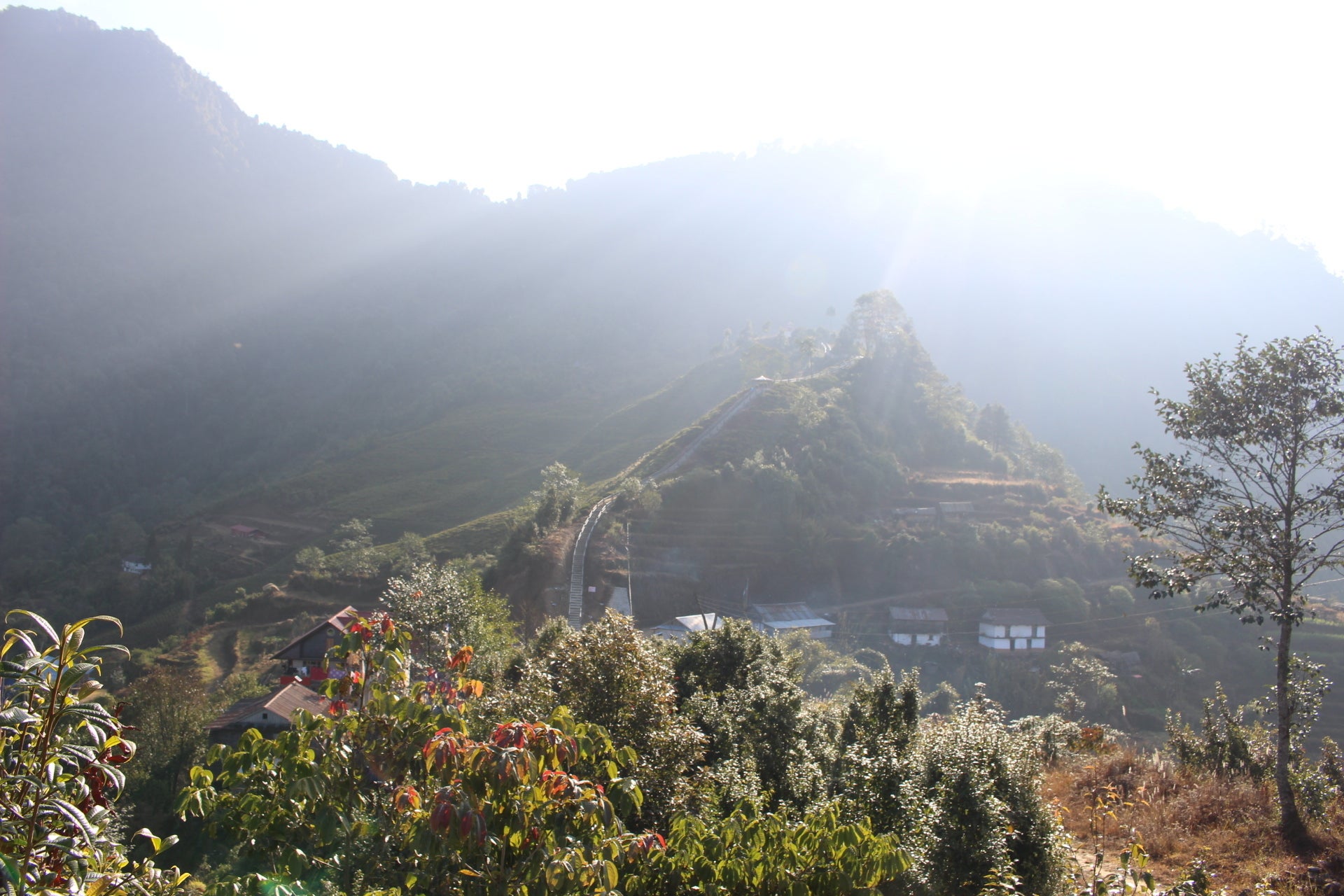 眼下には朝日に照らされキラッキラッと輝く茶畑が一面広がっていました。残念ながらカメラでいくら撮影しても、この畑のスケールや急勾配さをお伝え仕切ることができません!今回、実際に訪れて、この急な山の斜面にビシッとはりつくような茶畑での収穫作業はさぞかし大変だろうと思いました。作業されている農家さんの多くが女性です。このでこぼこの道を降りて、ヒマラヤの麓から来たお茶の希少さ、貴重さが改めて身にしみます。私といえば、なれない高度2500mで少し茶畑を歩き回っただけで動悸が早くなるわ、呼吸があらたくなるわと大変でした(苦笑)。カンチャン曰く、前回訪問した2017年に比べ、宿舎(私たちがとまった建物)ができていたり、訪問者を受け入れる体制もかなり整っていたようです。