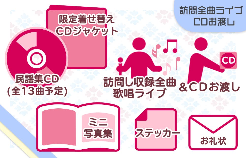・8,000円の方:故郷民謡集CD、クラウドファンディング限定着せ替えCDジャケット、特製ステッカー、お礼状、ミニ写真集は普通郵便にて送付します。