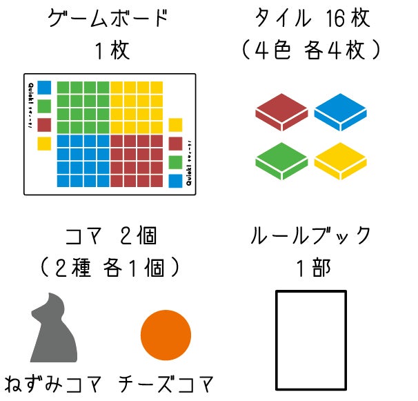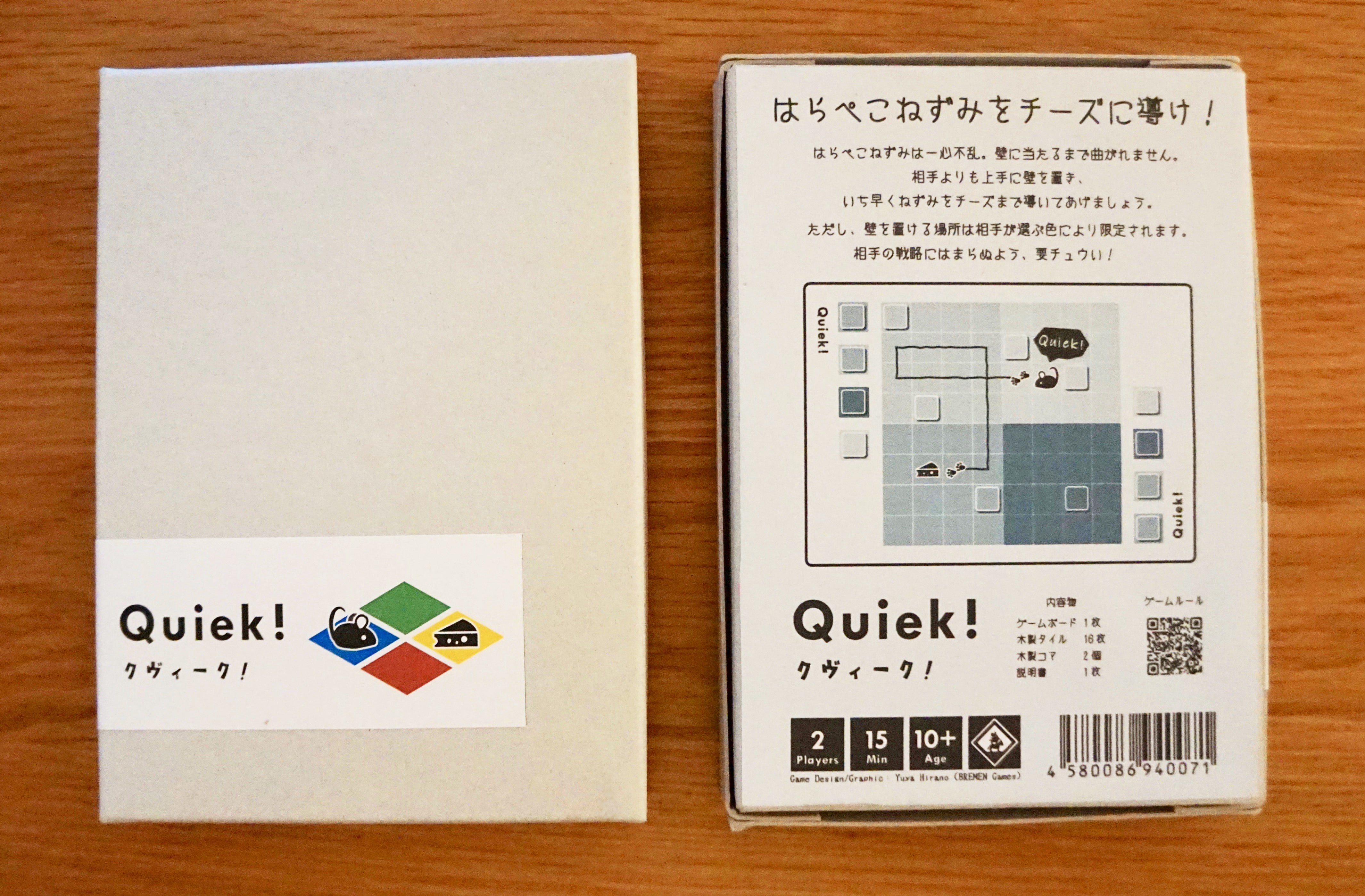 2019/10/30 08:00BREMEN Gamesの平野です。本日は「クヴィーク!」に含まれるコンポーネントをご紹介いたします。1. 木製コマねずみコマとチーズコマが一つずつ入っています。はらぺこねずみが狙うチーズはホールサイズのチーズのようですね。2. 木製タイル4色それぞれ4枚ずつのタイルが入っています。これがねずみをチーズまで導く壁の役割を果たします。各色2枚ずつを持って遊びます。3. ゲームボード開くとA4サイズになるゲームボードです。写真は手作りの試作品のものですのでしわや破れが目立ちますが、本番はキレイなものが届く予定です。4つ折り仕様になっているため、折りたたむとA6サイズに。この大きさで箱に入っています。セットアップを終えた状態がこちら。シンプルな盤面で繰り広げられる熱い頭脳戦をお楽しみください! もっと見る