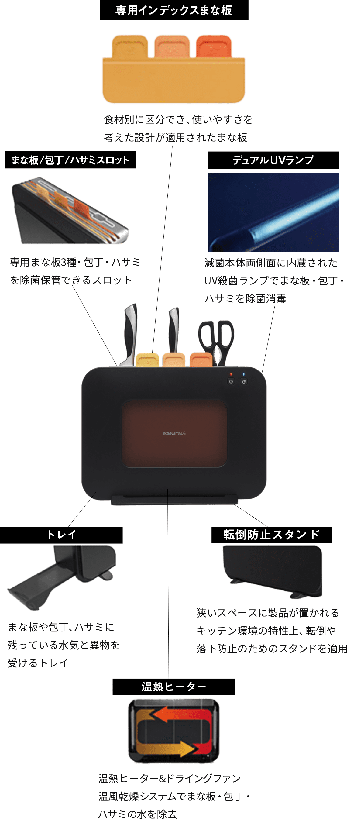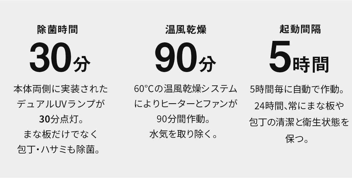 付属まな板に繁殖させた大腸菌、緑膿菌、黄色ブドウ球菌などを塗布し、実際の使用環境に限りなく近い状態を再現して30分間UV照射させた後の細菌減少率が99.9%であるという結果を、研究機関KCL(*)が証明しました。