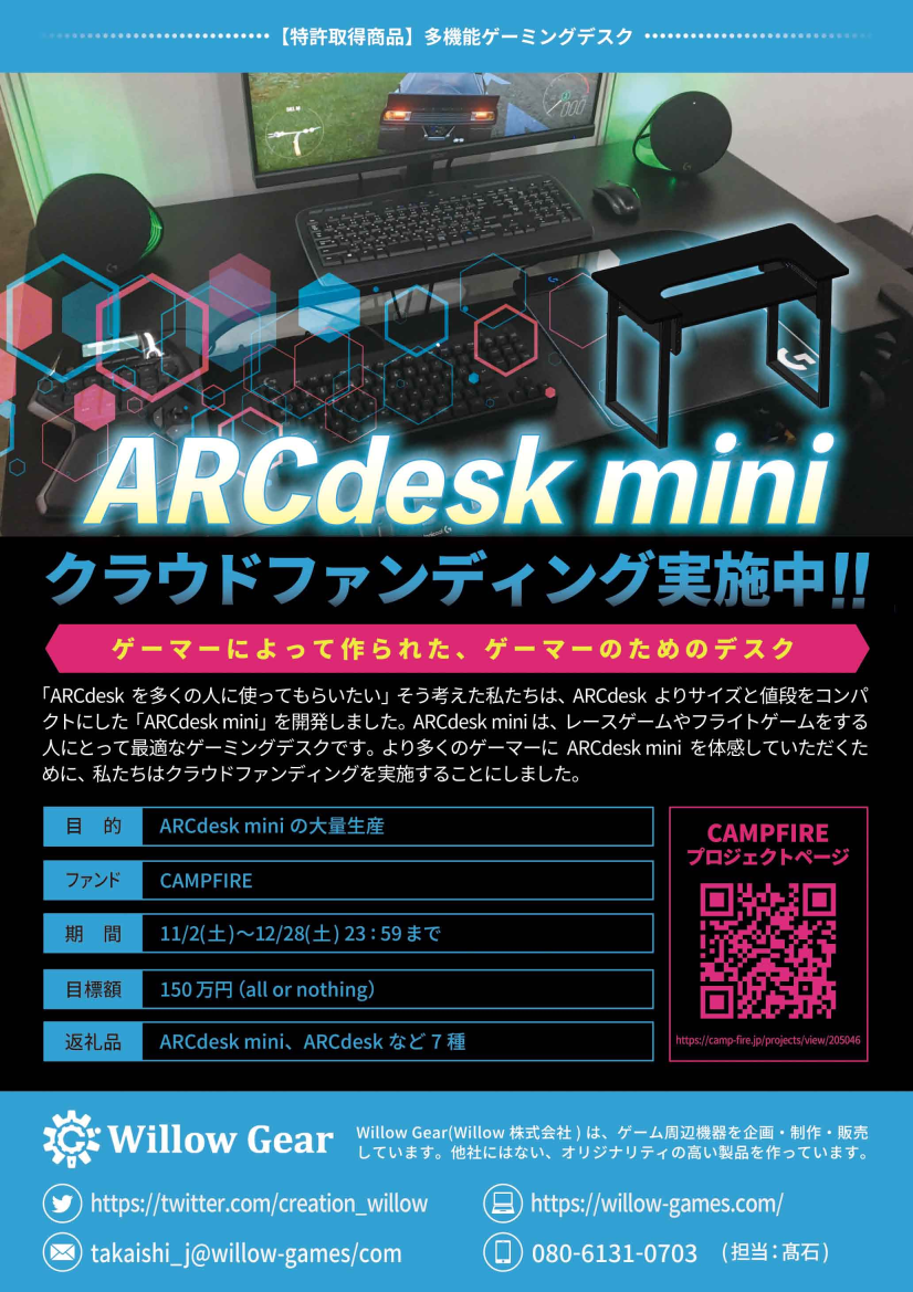 クラウドファンディング終了まで5日を残して目標額に到達し、プロジェクトが成功しました。ご支援いただいた皆様、ご協力・応援していただいた皆様、本当にありがとうございます。皆様の支えがあってプロジェクトを成功させることができました。この場をお借りして感謝をお伝えしたいと思います。●ARCdesk/ARCdesk miniを展示していただいているお店ASHWINDER様渋谷ロフト様ツクモ池袋店様ツクモ難波店様ツクモ名古屋店様パソコンSHOPアーク様当社のために店舗スペースを確保して展示していただき誠にありがとうございます。ARCdeskは実際に触れてみないとなかなか購入まで結びつきにくいため、実機を展示していただけるお店は当社にとって非常にありがたいです。引き続きどうぞ宜しくお願いいたします。●メディアで紹介していただいた方々アフロマスク様 https://www.youtube.com/user/AfrooMaskpicar3様 https://www.youtube.com/channel/UCoMxll-5PJ2OEcsNW3Hkucg4Gamer.net様ねとらぼ様●イベントにご協力いただいた企業様アニモホールディングス様株式会社エアリア様エンターフォース株式会社様株式会社佐賀新聞サービス様株式会社スサノオ様(50音順)●ARCdeskユーザーの方々Erix様ぬぇ様wosp様●動画編集らる様●CAMPFIRE公式キュレーター大村和彦様●special thanks東京ゲームショウにスタッフとして参加してくれたしゅんくん渋谷ロフトイベントに最初から最後までいてくれたruusan(中学1年生)ARCdesk/ARCdesk miniに携わっていただいた方々、ご協力いただいた方々本当にありがとうございます。思い返すと、本当に多くの方に支えられていたと実感しています。この中のうちお1人・1社でも欠けていたら成功していなかったかもしれません。全ての方に感謝を申し上げたいです。最後に、ARCdesk miniプロジェクトにご支援いただいた方々に感謝を申し上げます。まだまだ実績が無い当社に出資することは、大なり小なり不安があったことかと思います。そんな中ご支援いただけたことに本当に感謝しております。支援して良かったと思っていただけるよう、精魂込めて製造・発送いたします。この度はご支援いただき誠にありがとうございます。残り5日、最後まで走り抜けたいと思います。ご支援・ご協力していただいた皆様ありがとうございます。