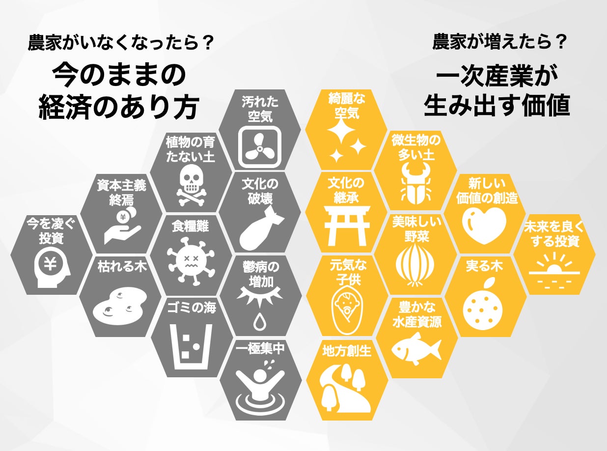 農業は、経済の発展だけでなく、「果実の実る木が残る」「地方が創生される」「豊かな水産資源が残る」などの新しい価値を創出できます。