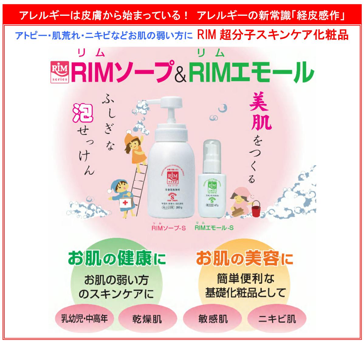 アトピーをはじめアレルギーやお肌のトラブルでお悩みの方が多く特に子供で激しいアトピーの人は 「かゆみ」 が大きなストレスとなります。そんな中で今秋より予防医療がスタートし、お肌のトラブルなどの改善に大きな期待が持てる超分子スキンケアRIMソープ&RIMエモールを広くお使い頂く事でアトピーやアレルギーの 「ゼロ」 を目指します。
