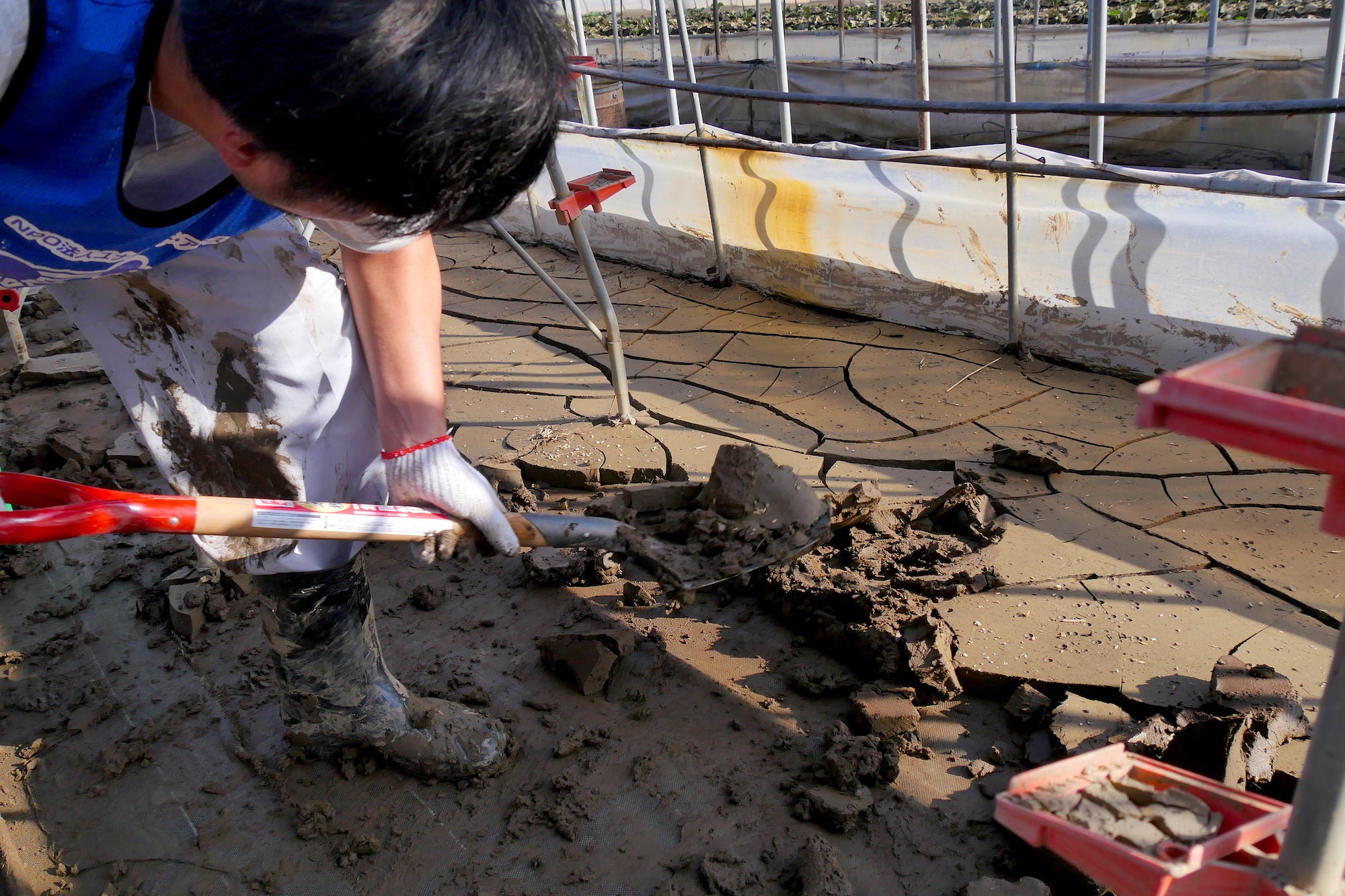 家族で家屋を片付けつつ、泥にまみれた農地も整備する。