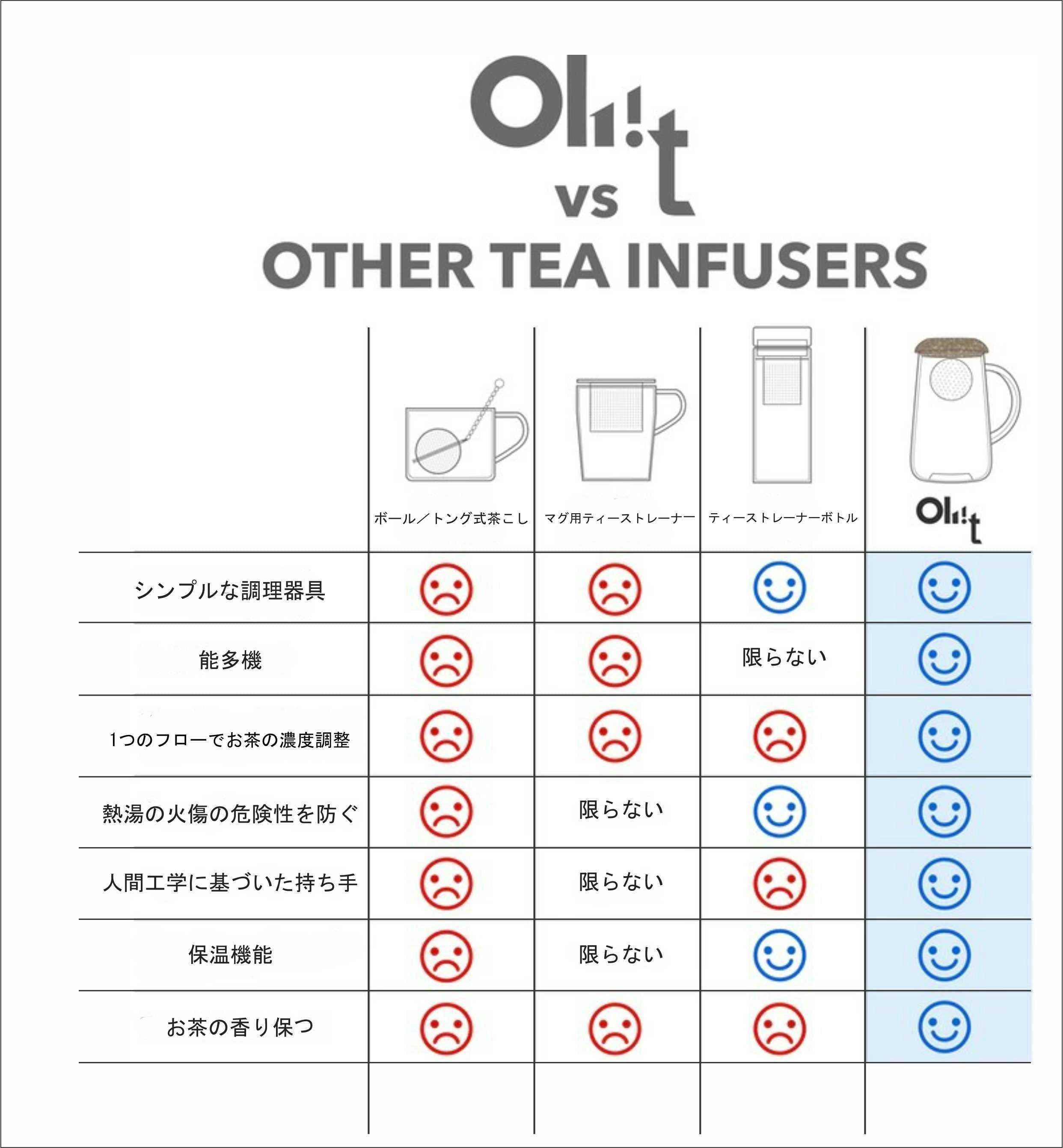 「Oh!t」の設計は、「人間」の要望、習慣、認識に基づいて開発され、すべてを人間工学に関連しています。12の気配りデザインで、一人で楽しむもよし、大勢で楽しむもよし、お茶を手軽に快適に楽しもう!