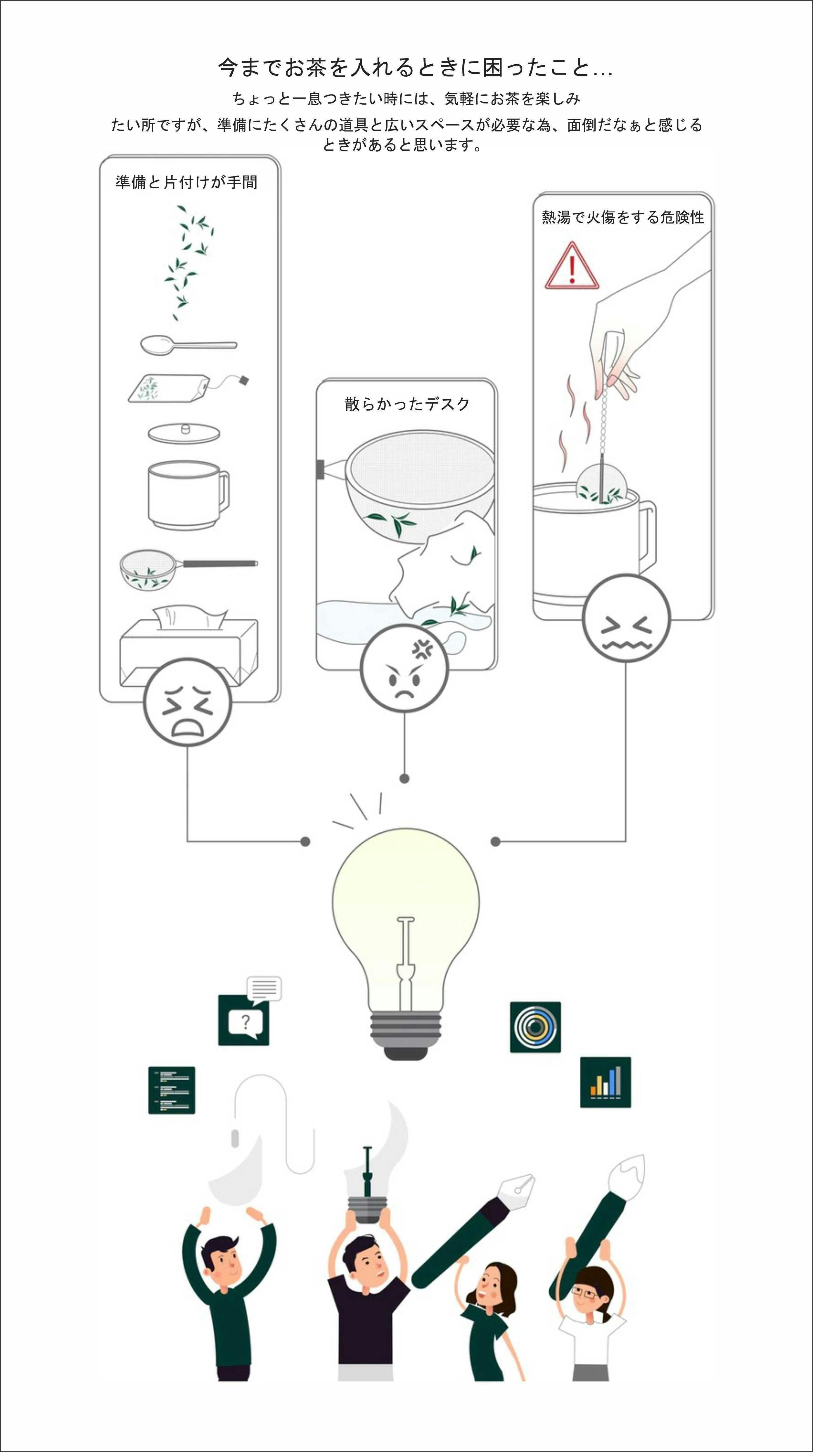 昔ながらのお茶の入れ方は、誰もが経験したことがあると思います。 複雑な道具や手順は、学生やサラリーマンにとって不便ですし、熱湯で火傷をする危険性もあります。«Oh!t™ マグネット付き3-in-1マルチティーカップ»はお茶の淹れる工程を簡略化し、お茶の香りを残したまま、手軽にお茶本来の味を体験できます。私たちの使命は、「デザインで人を感動させる」ことです。皆様に新しい体験をお届けし、より豊かな暮らしを実現したいと思います。
