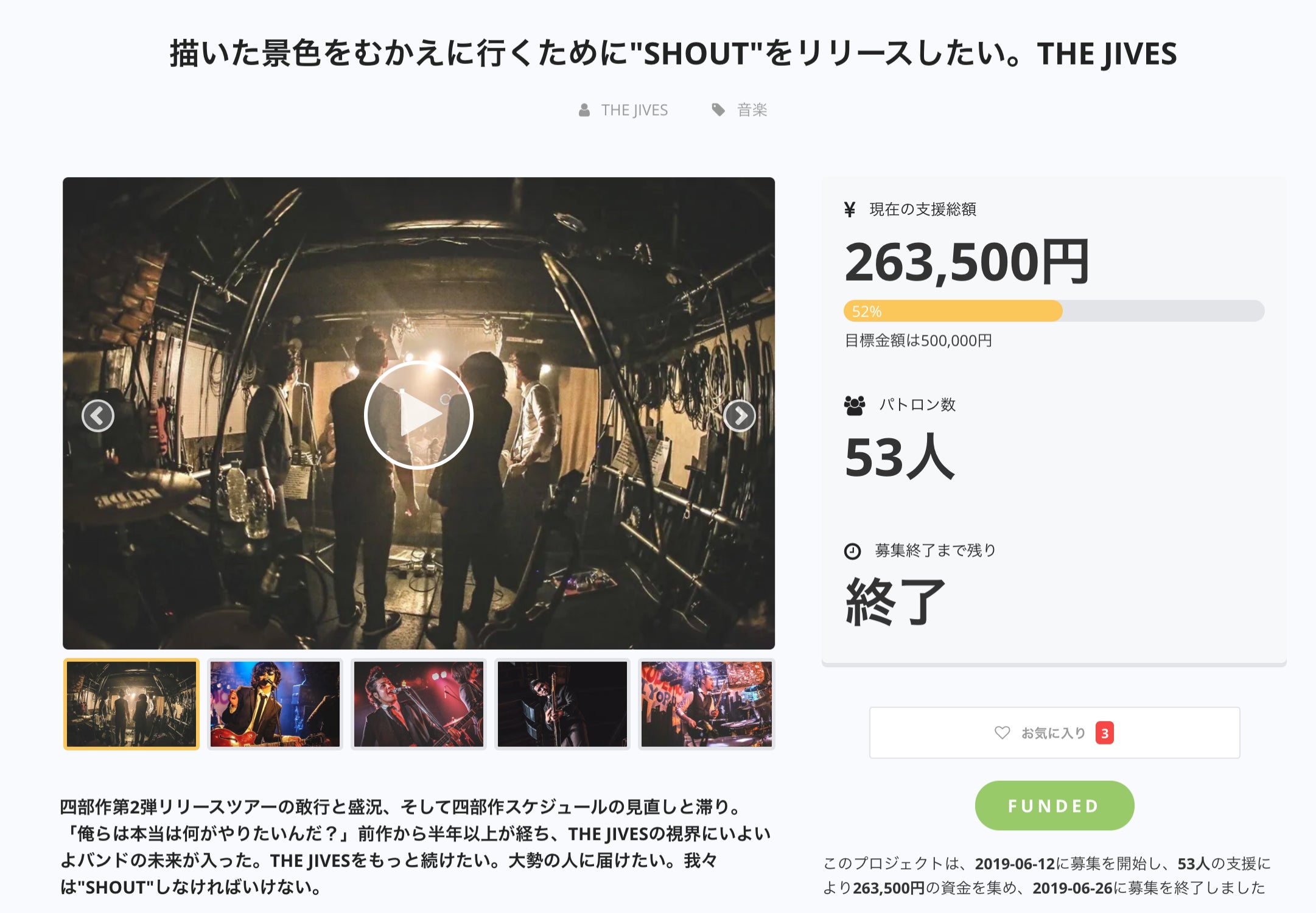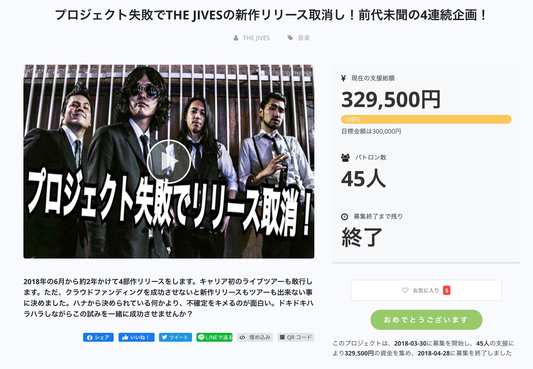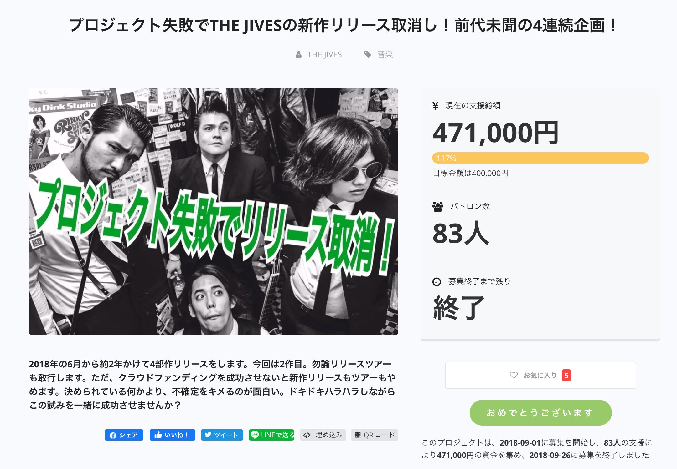 ここまで読んでくれてありがとうございます。改めて、ロックンロールバンドTHE JIVES(ザ・ジャイヴス)です。四部作への挑戦を始めてから4回目となる今回のクラウドファンディング。