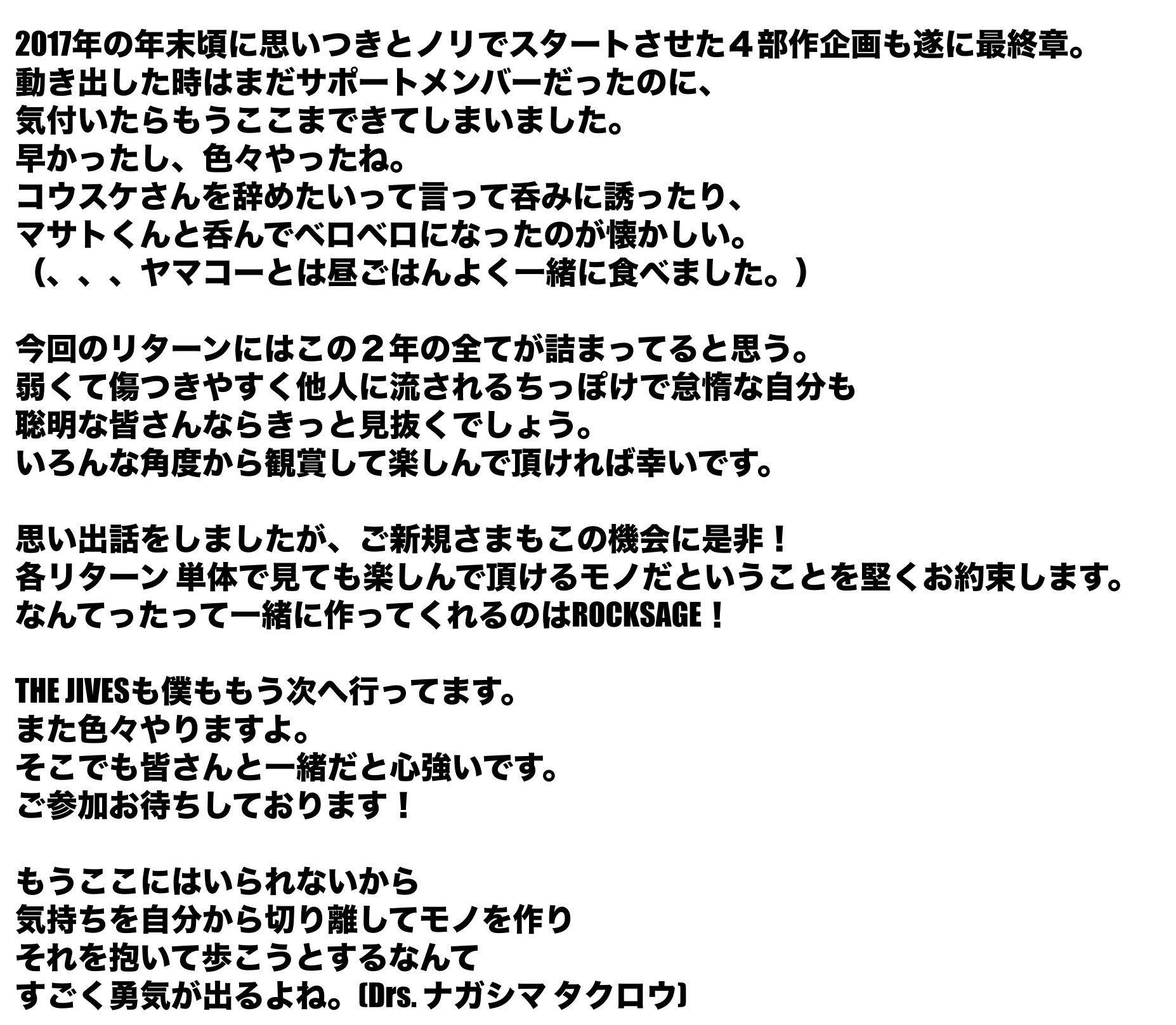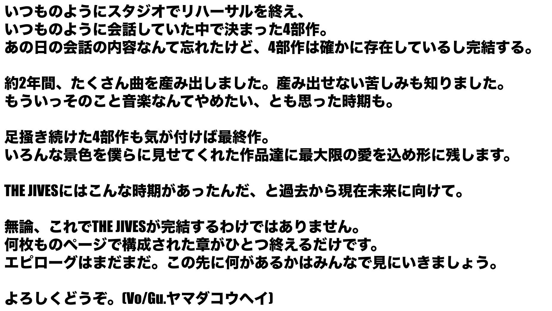今後THE JIVESを語るにあたって、間違いなく外せないトピックになる四部作リリースへの挑戦。THE JIVESが一番THE JIVESと向き合った2年間。THE JIVESとしての自分に深く向き合った期間。この期間を僕らは忘れたくないし、あなたにも忘れて欲しくない。あなたがTHE JIVESを見てきたこの時間をぜひ未来に持っていって欲しいし、僕らが今後出会う人に四部作という挑戦を届けたい。