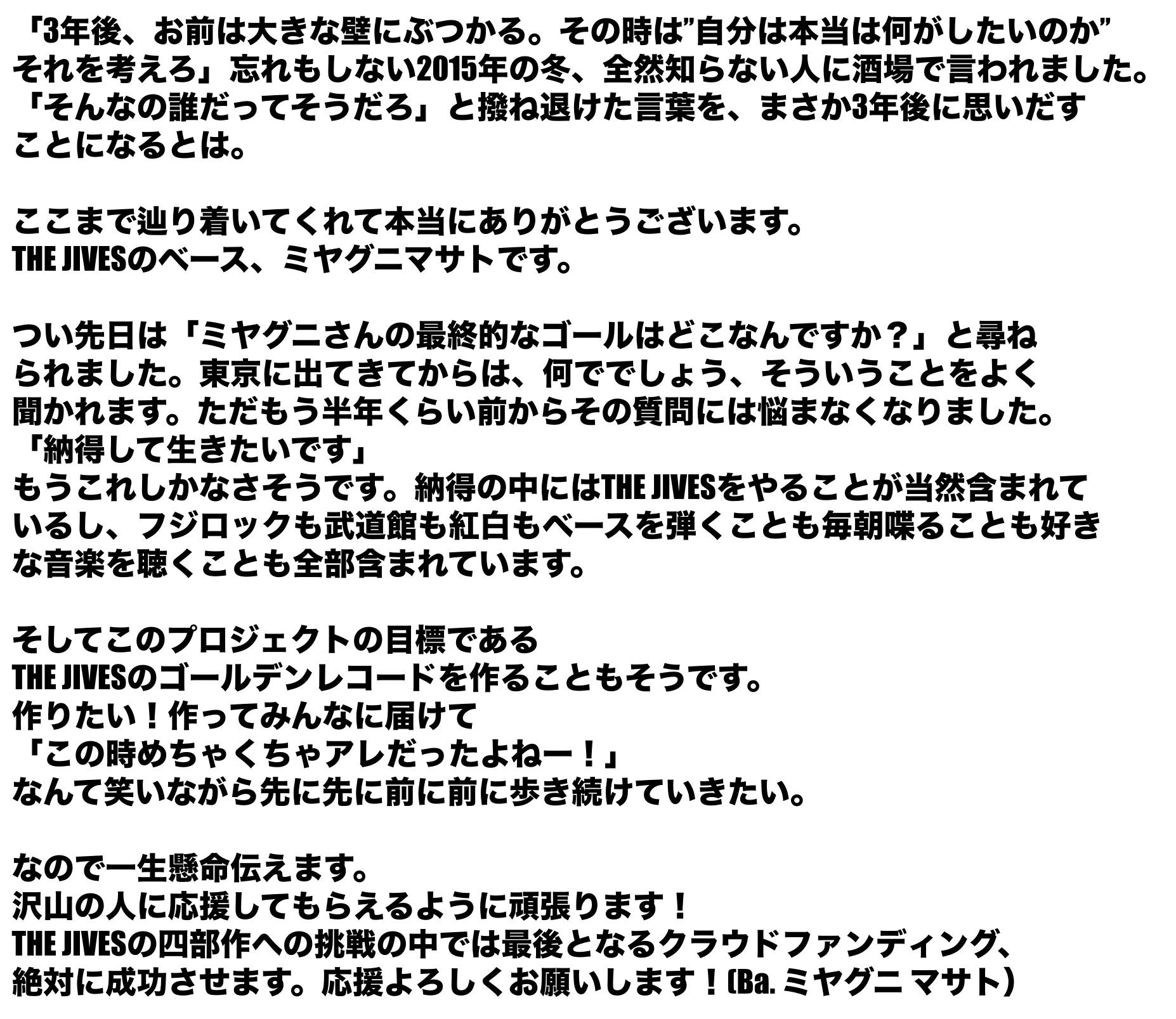 四部作第4弾の「Audrey」と共に始まった今回のプロジェクト。THE JIVESが2年間挑み続けてきたチャレンジを色んな形で残したいと考えています。フジロック、武道館、紅白。もっと沢山の人に知ってもらいたいし、もっと沢山の人に楽しんでもらいたい。もっとTHE JIVESを続けたいので頑張ります。ぜひ応援をよろしくお願いします!THE JIVESはみんなと一緒に大きくなっていきます。メンバーからも意気込みが届いています。