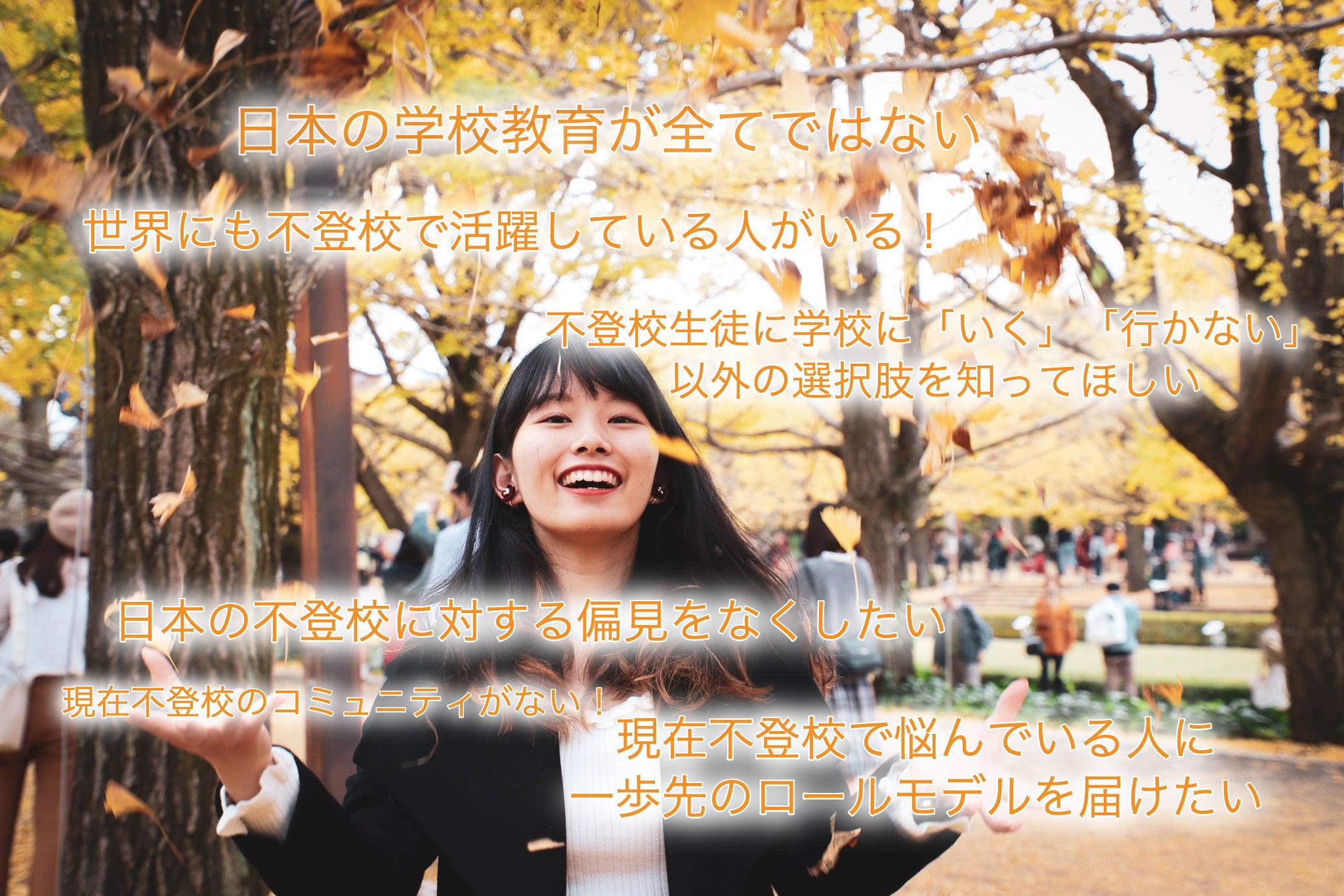 これまで、世界各国の教育現場の視察を行ったり、日本の教育の未来を支えようと学んで参りました(国際バカロレア免許、日本の教員免許も取得中です)。そして、2019年から不登校の留学支援を通じた事業(合同会社YOURCOLOR)を立ち上げ活動しております。活動を通じて多くの医療関係者やフリースクールの方とお話するうちに、不登校のオンラインのコミュニティの少なさ、そして、不登校が不登校を支えるという文化が現存していないことを痛感し、不登校を応援するプラットフォームの作成を決意しました。