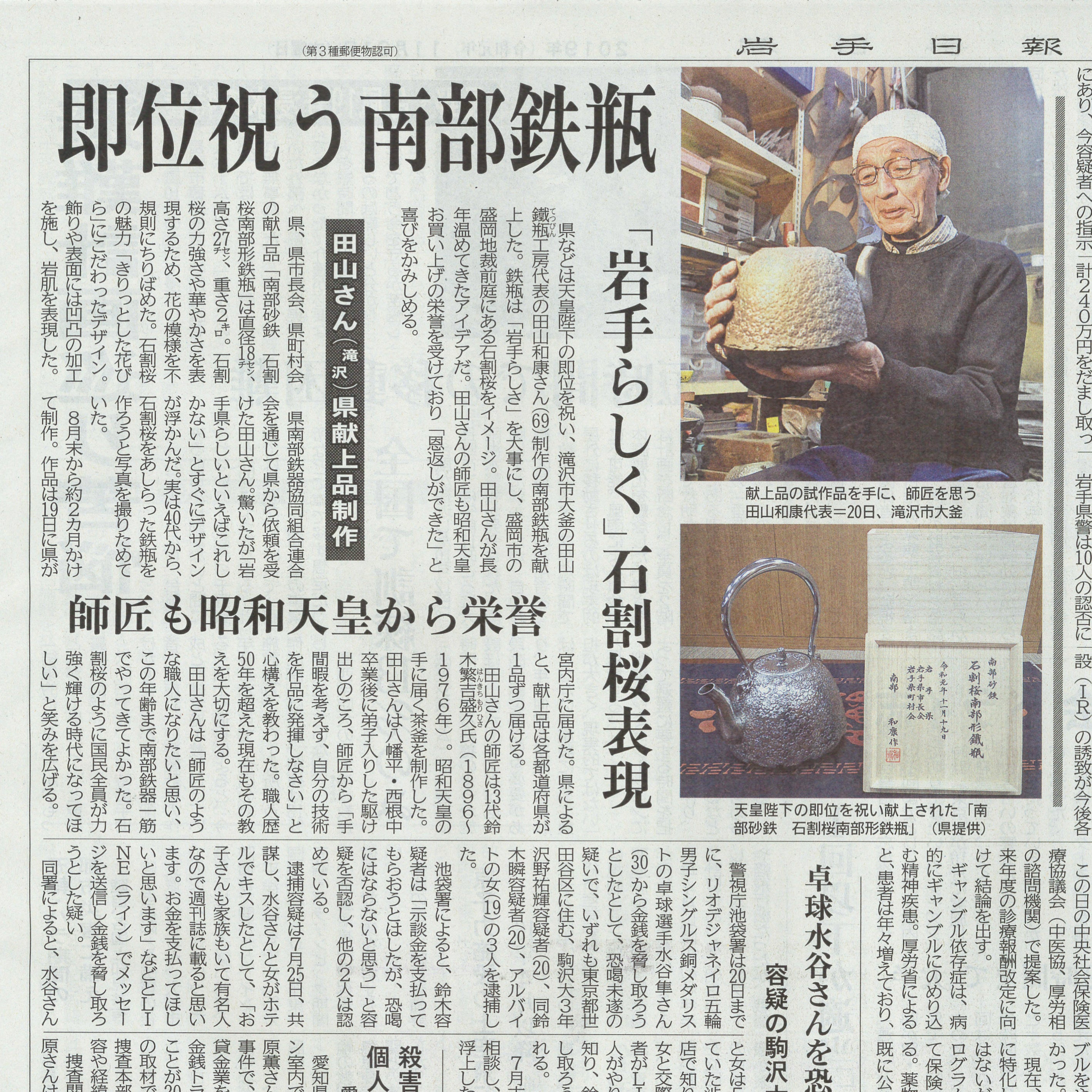 天皇陛下の即位を祝う南部鉄器「南部砂鉄 石割桜南部形鐡瓶」を、kanakenoを運営するタヤマスタジオの代表の父であり技術顧問でもある田山和康がつくらせていただいたことを先日ご紹介しましたが、岩手日報さんにも大きく取り上げていただきました。(11月21日 朝刊)いつもありがとうございます!