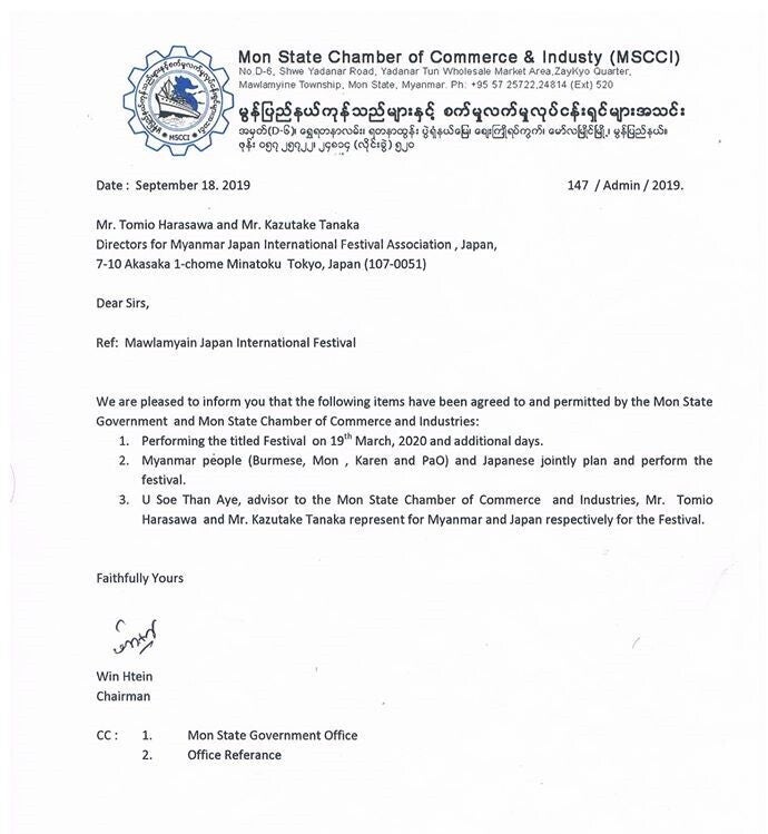 以下の項目が、モン州政府とモン州商工会議所によって合意され許可されたことをお知らせいたします。