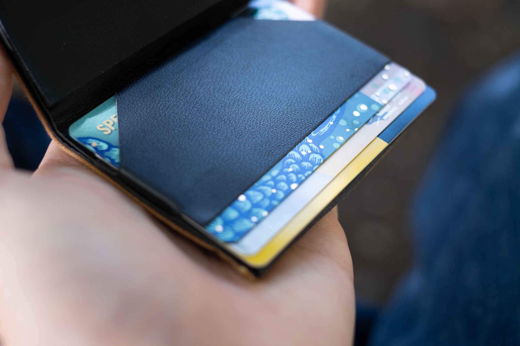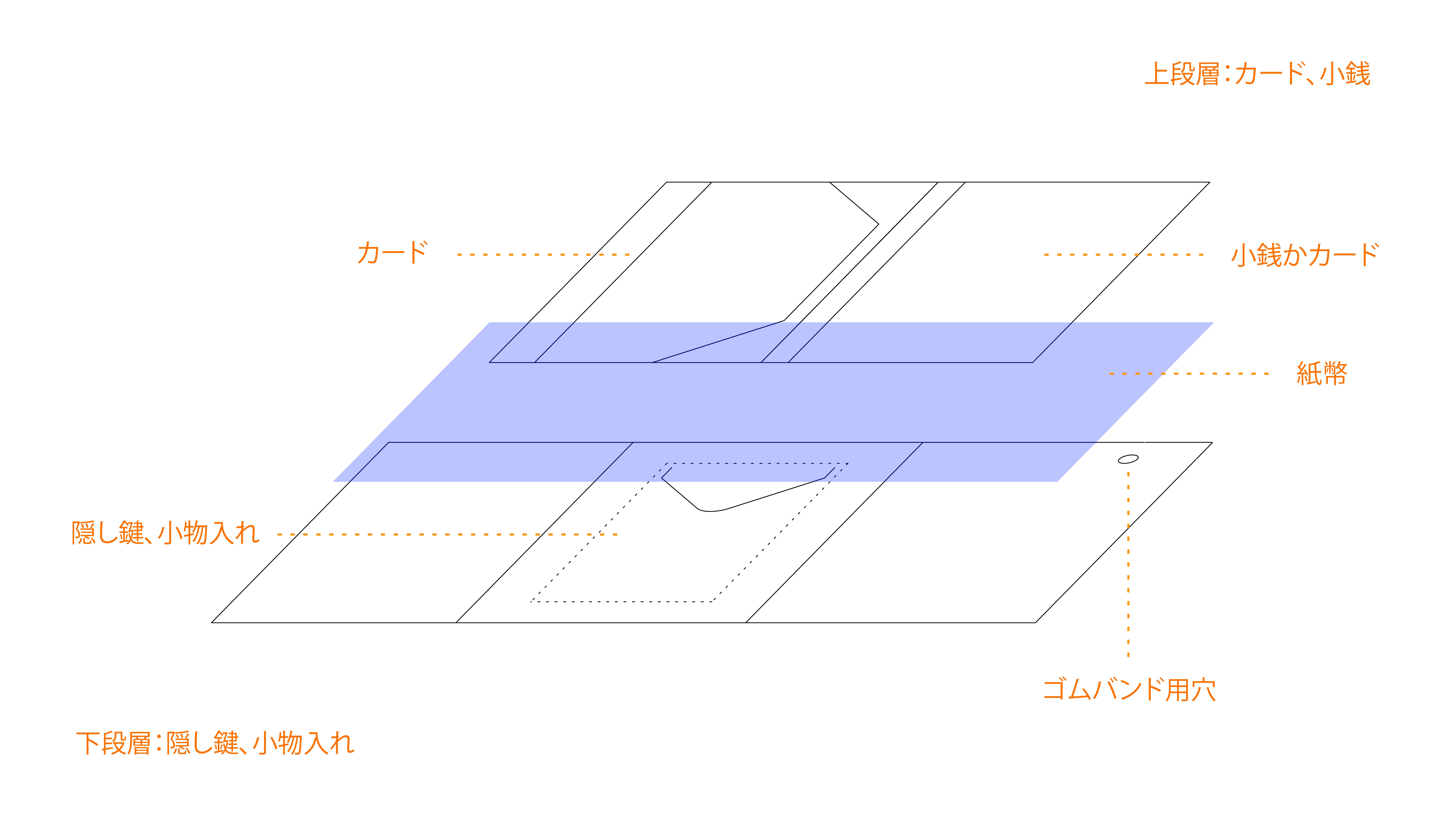これによりカードサイズとほぼ同じ本体サイズが実現できました。(通常の財布は内容物より~5mmほど一回り大きい本体寸法のものが多いです)