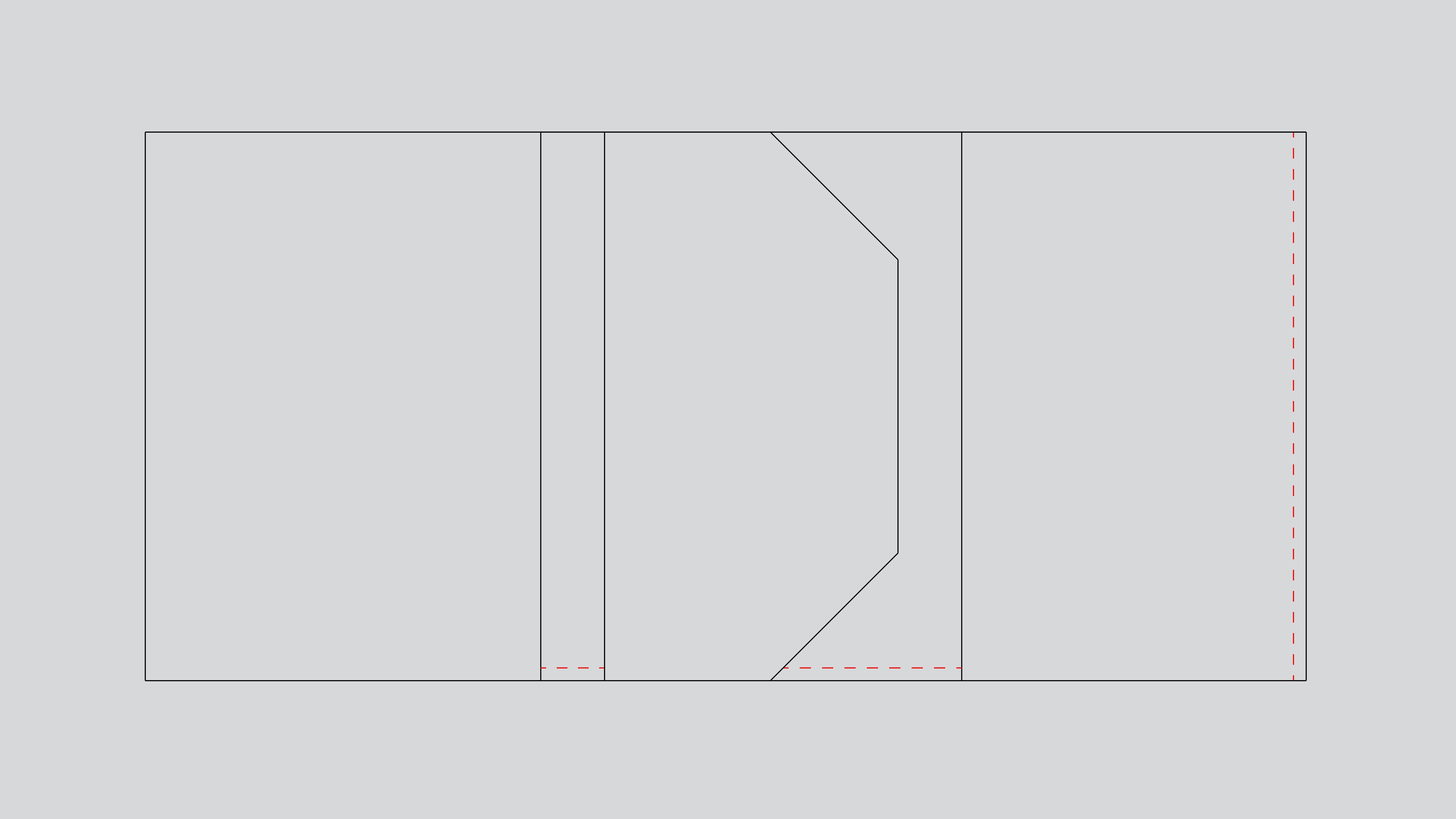 Litt2がカードとほぼ同じくらいの小さいサイズを実現できた理由の1つに縫製線の位置の工夫があります。下の図の赤点線部分が縫製線ですが、カード入れとコイン入れにマチを加えることで縫製線に関係なくカードの端と財布本体輪郭線の端が合うようになっています。