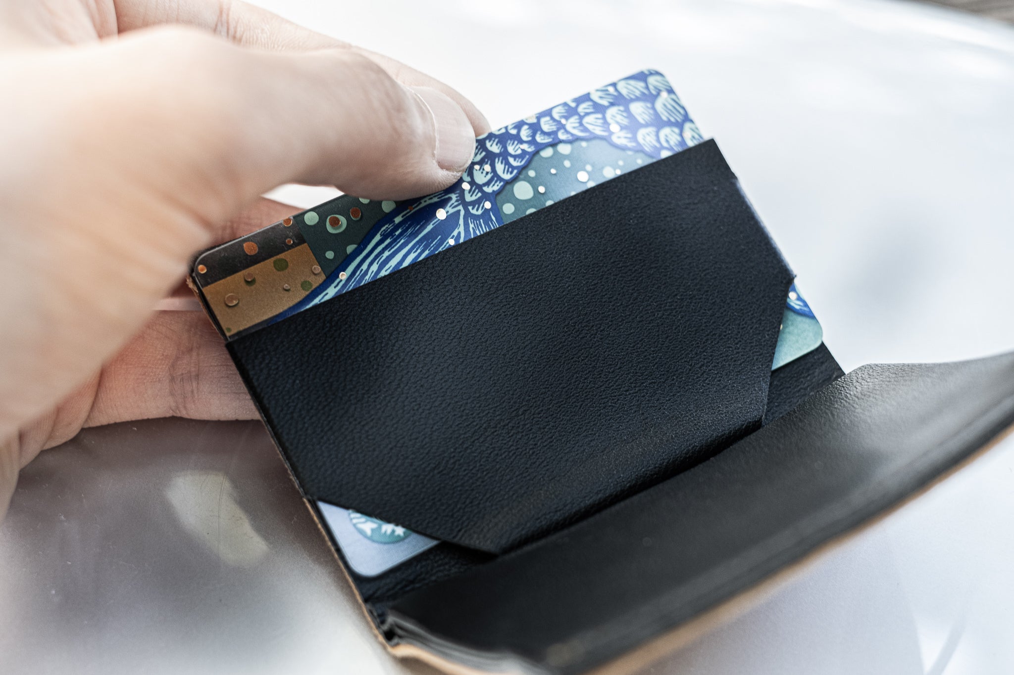 ・内側は山羊革素材の為、最初はカード類を入れる時にきつい可能性がございますが使用していくうちに自然に伸びていきます。最終的に入れたいカード枚数より多めに入れておくと伸びやすくなります。