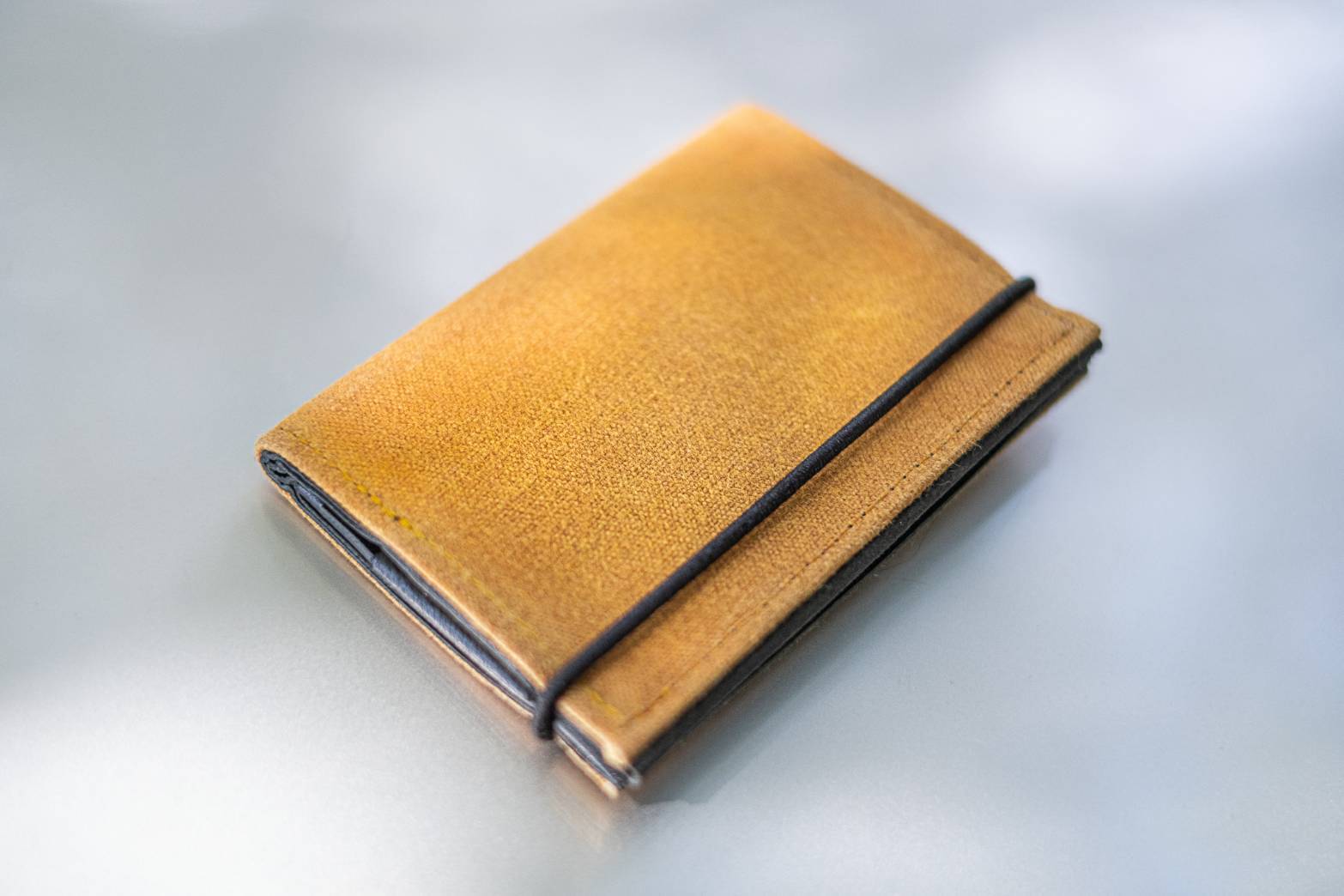 薄く設計されている「Litt2」の最大の懸念は耐久性。薄く作るためには、採用する素材も薄くする必要があり、耐久性が犠牲になりやすいのです。6mmの薄さを可能にしてくれたのは、ゴートレザー(山羊革)と帆布(はんぷ)という財布としては珍しい素材の組み合わせです。