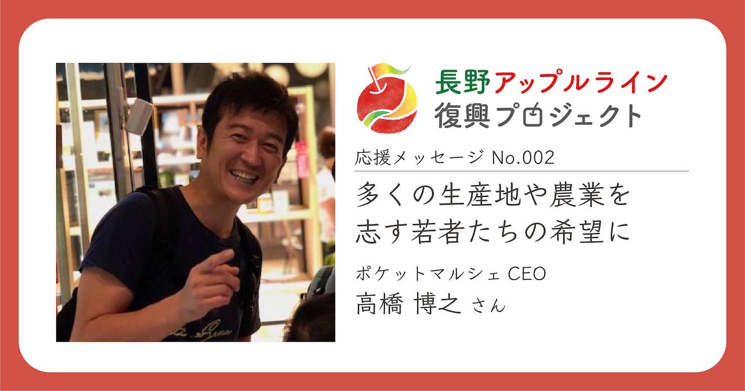第2回目は、農家や漁師といった生産者と消費者を直接つなぐサービス『ポケットマルシェ』の代表として、全国の作り手をサポートしている高橋博之さんからいただきました。今回のアップルラインの被災に対しても、いち早く支援の声をあげてくださいました。