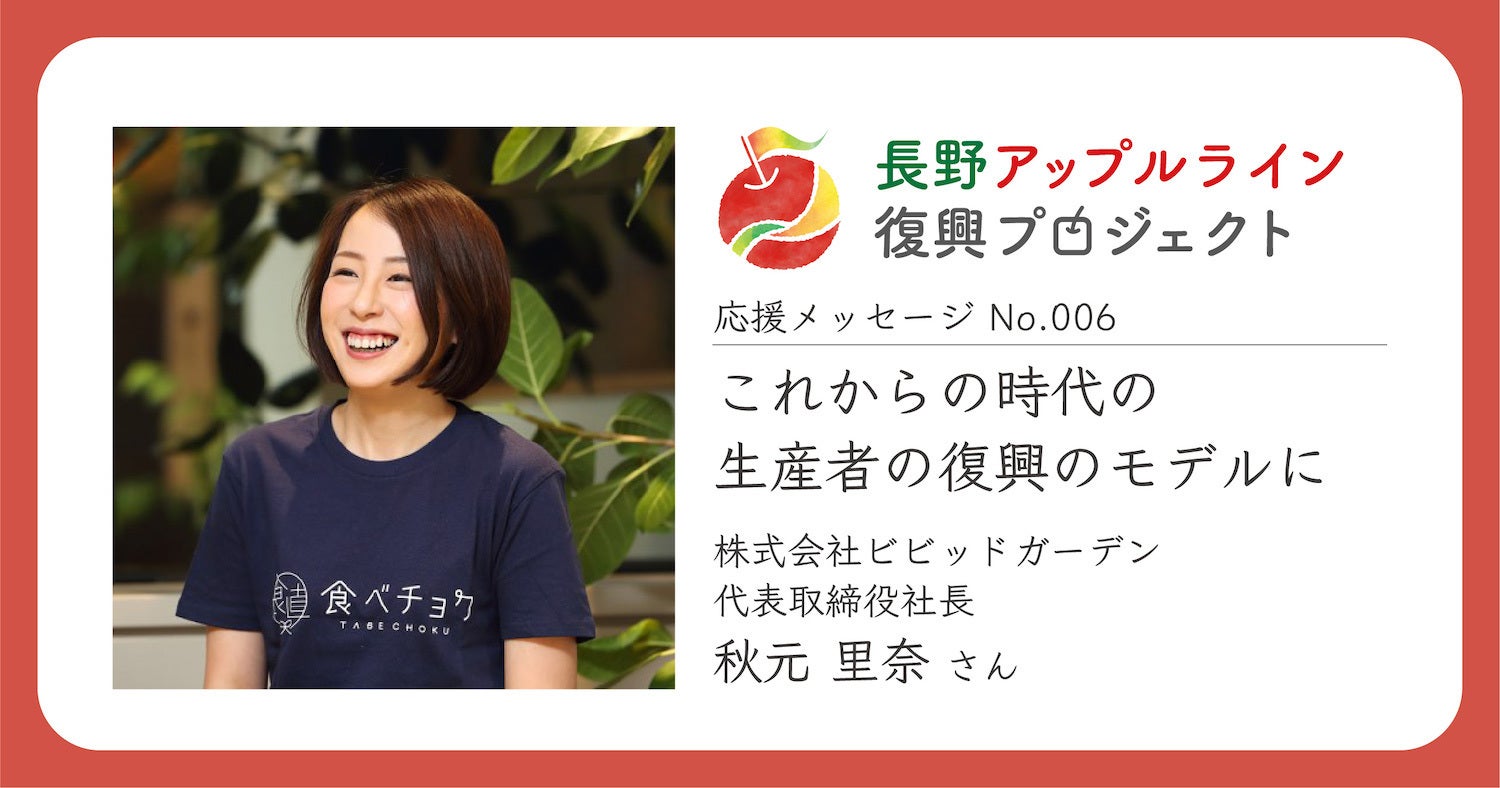 第6回目は、生産者の商品を消費者へと直接届けるオンライン直売所『食べチョク』を運営されている、株式会社ビビッドガーデン代表取締役社長の秋元里奈さん。台風19号による被害を受けた生産者を支援する販売プログラムを立ち上げてくださったことをきっかけに、支援の輪が大きく広がっていきました。