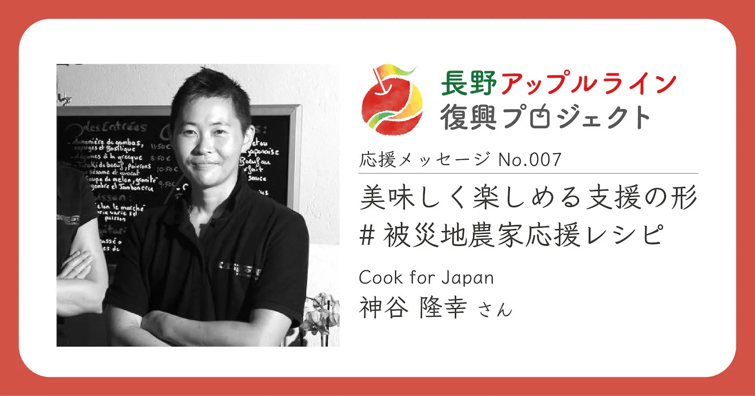 この動きを受けて、本プロジェクトの代表である徳永の農園がネット上で販売していたりんご1000kgは、瞬く間に完売。レシピを公開したシェフたちとともに「Cook for Japan」という団体を立ち上げ、台風19号などにより被災した全国各地の生産者の支援を続けていらっしゃいます。
