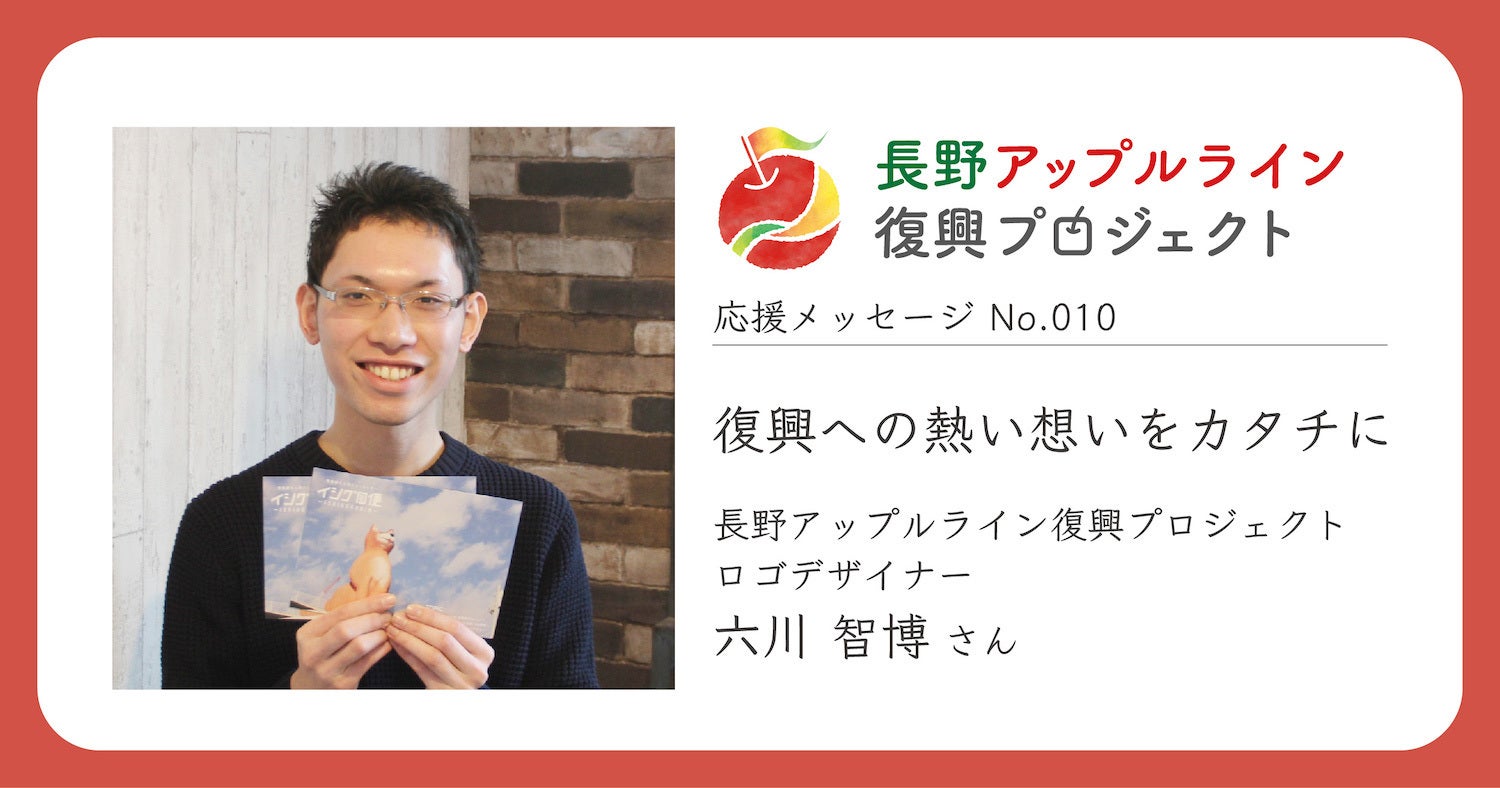 第10回目は、㈱アドイシグロのデザイナー、六川智博さん。『長野アップルライン復興プロジェクト』のロゴデザインを作っていただきました。六川さんもまた、アップルラインの近くにお住まいで、今回の台風19号では自宅付近の冠水や停電を経験されています。