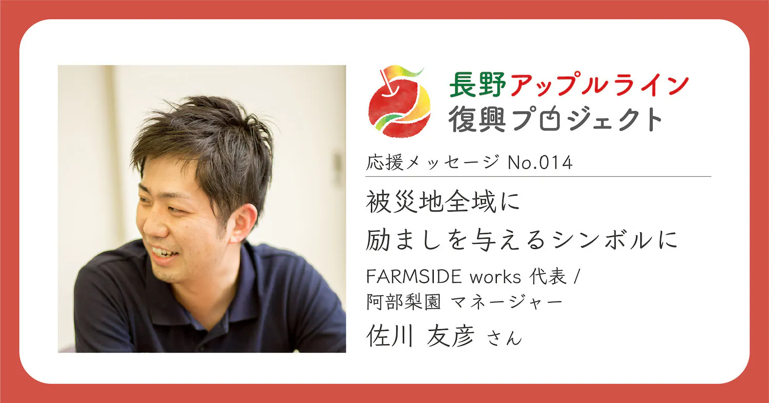 第14回目は、FARMSIDE works 代表 / 阿部梨園 マネージャーの佐川友彦さん。いち農家として、今回の台風被害や農業課題に対する想い、そしてプロジェクトへの賛同の言葉を綴っていただきました。