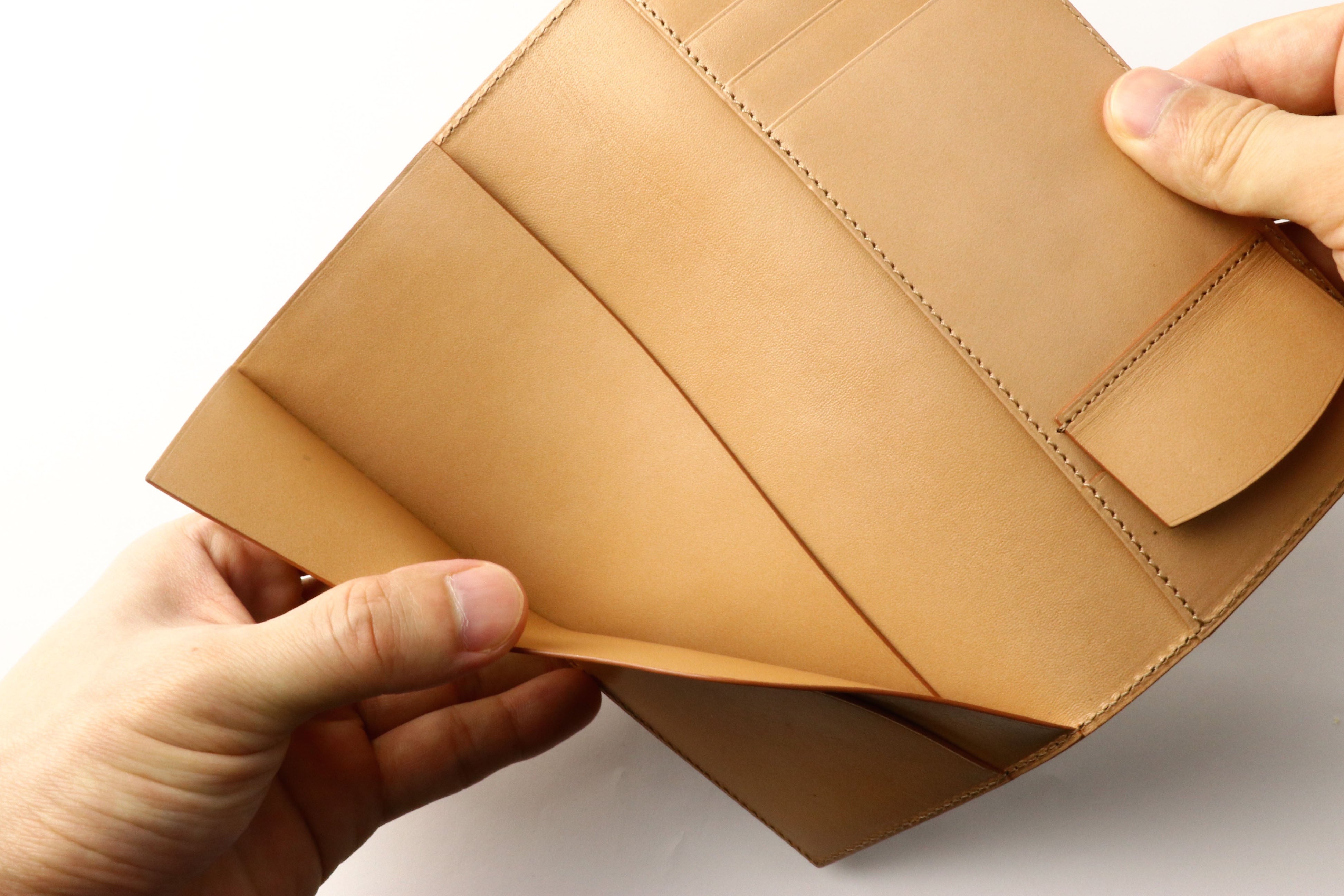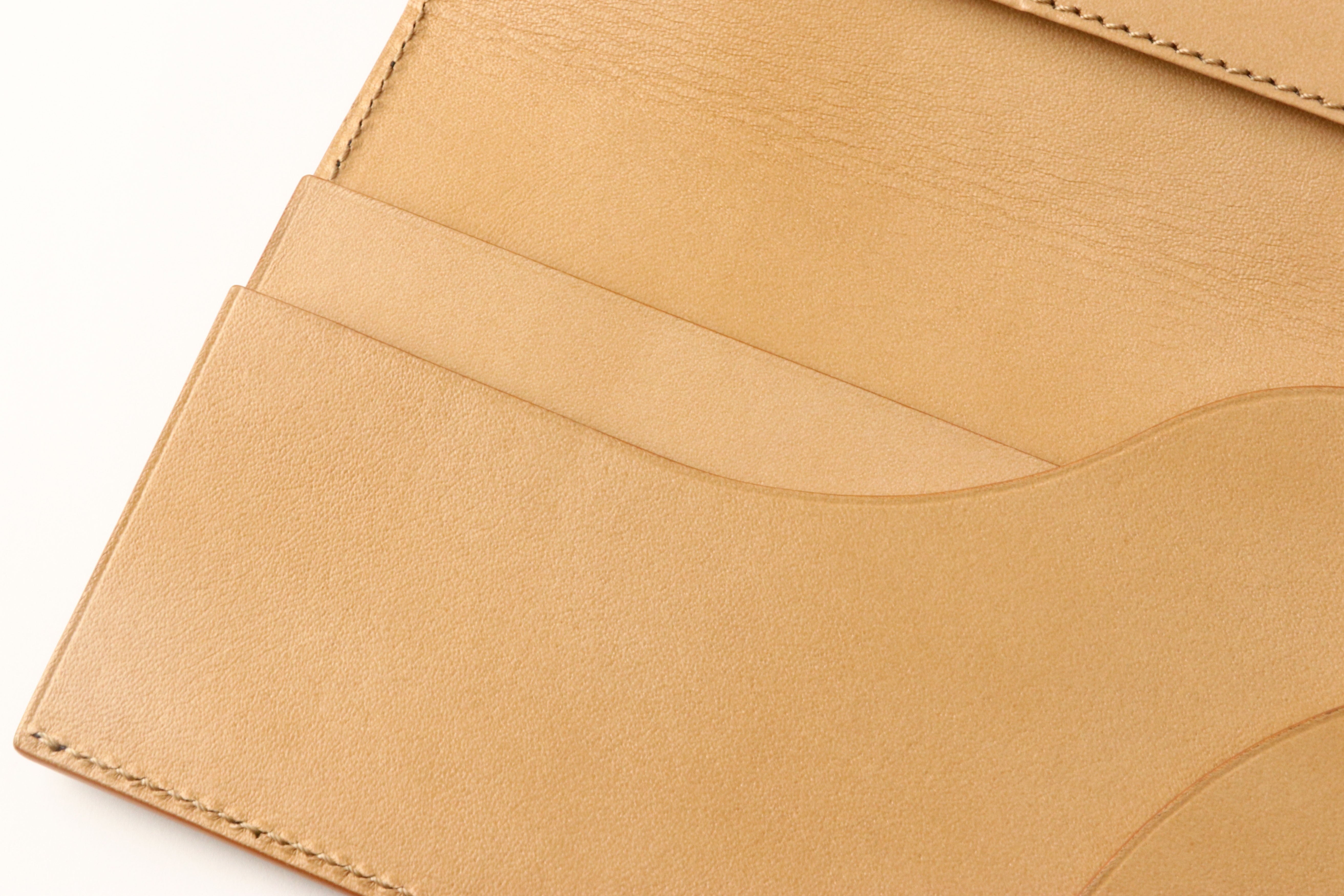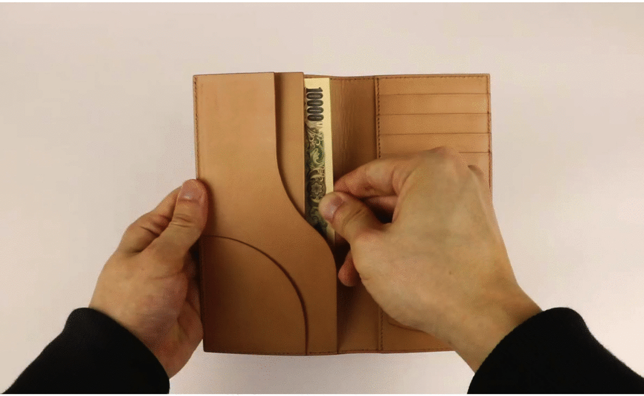 紙幣を斜めにスライドさせながら収納する事により限界に短くした長さでも紙幣収納時のつっかかりはなく、コンパクト長財布によくある紙幣の出し入れ辛さはありません。
