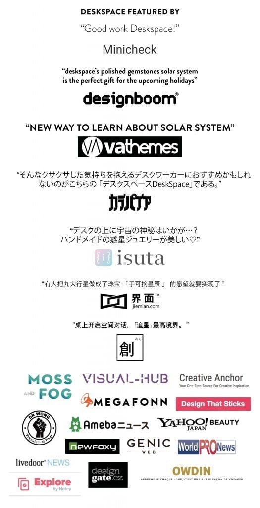 DeskSpaceはすべてを「宇宙、スペース」と関連させる会社です。当社のソーラーライトは当社製品の中の1つです。当社はまた、素晴らしいDeskSpaceソーラーシステムセットも販売しています。こちらの新しいセットは、当社のオーダーメイドの陽極処理が施されたアルミニウムベースを特色とし、ソーラーライトとのマッチングアイテムとして完全に機能する為、オリジナルのソーラーセットよりもさらに上を行く製品となっています。