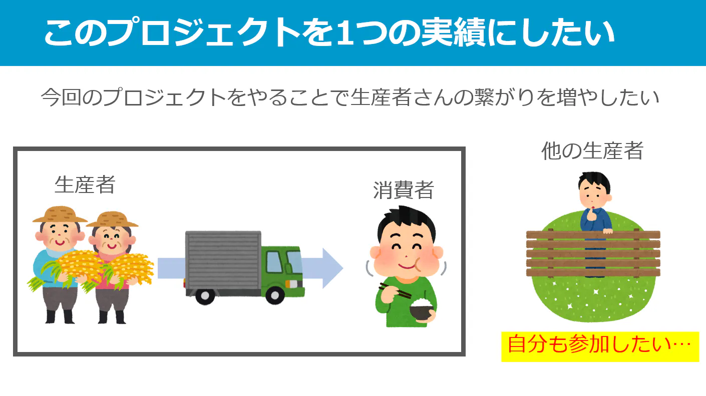 今回のプロジェクトでは「生産者と消費者が近い距離で取引を行うこと」の橋渡し役をしたいと考えています。