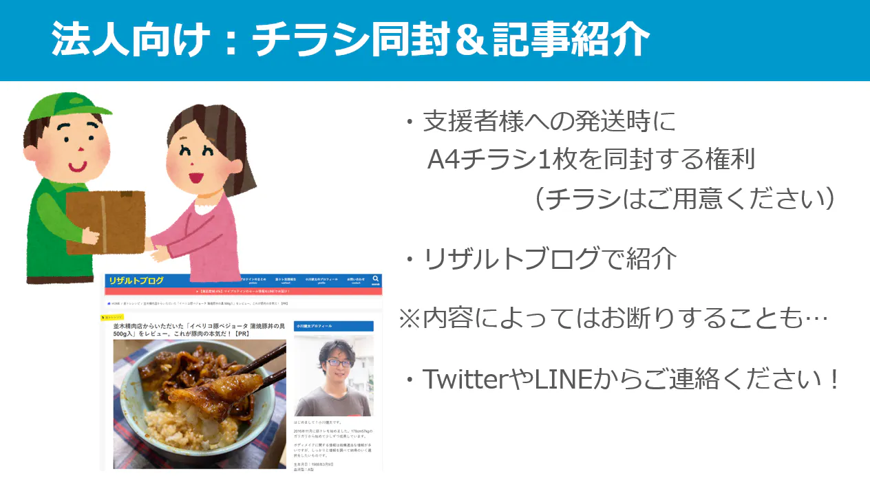 【法人向けリターン】30,000円:郵送するすべてのリターンの郵送物の中にチラシを入れられる権利+リザルトブログでの記事紹介