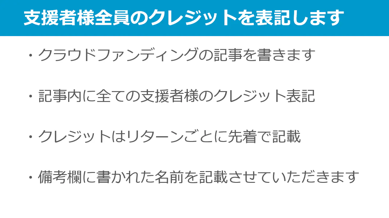 そして本プロジェクトにご支援いただいた方のお名前をその記事内に記載させていただきます。(法人名、団体名、ニックネーム可。全角20文字以内でお願いします。)