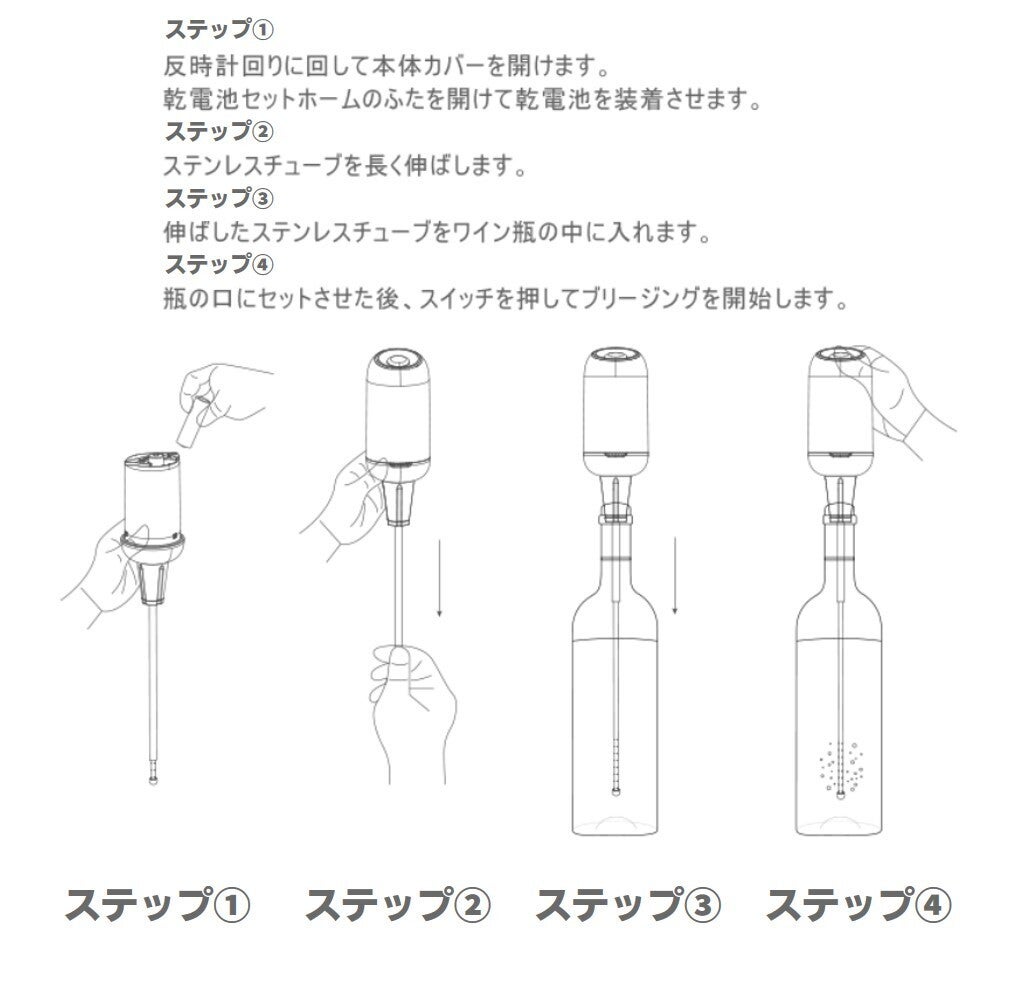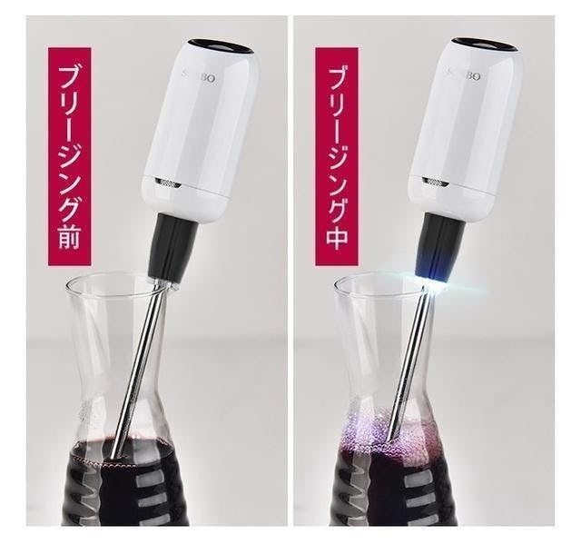 EASY SORBOワインエアレーターならワイン瓶に差し込んで上部位置するボタンを軽く2秒押しするとブリージング!
