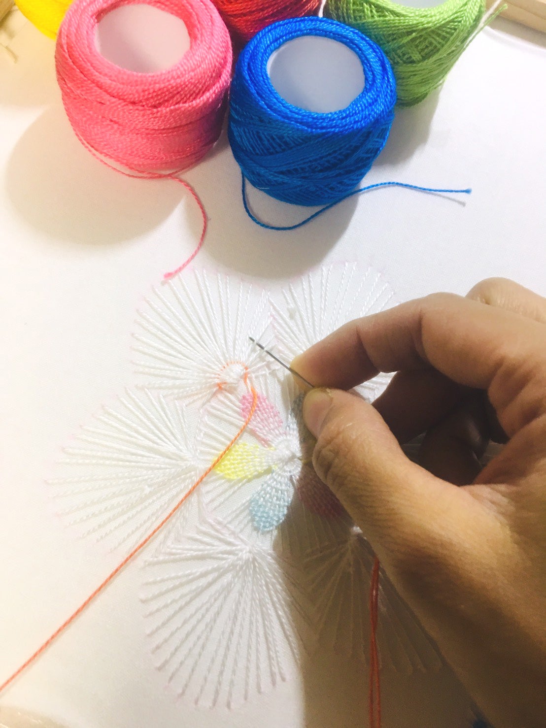 千森麻由先生が表紙に使うための作品でドイリーと呼ばれるお花のニャンドゥティを制作中です。