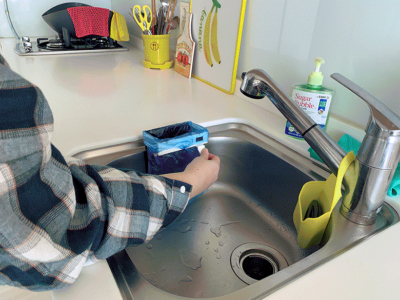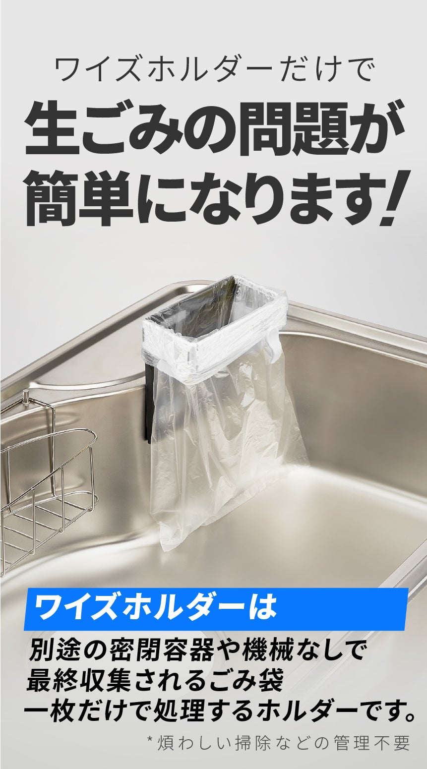 生ごみを管理するとき、煩わしい行動が続けて発⽣しました。しかし、ワイズホルダーは最終回収される袋⼀枚で⽣ごみ処理を終えるように作られました。また⽣ごみを保管する容器をあらう必要がなくなり、洗剤の無駄遣いを減らします。