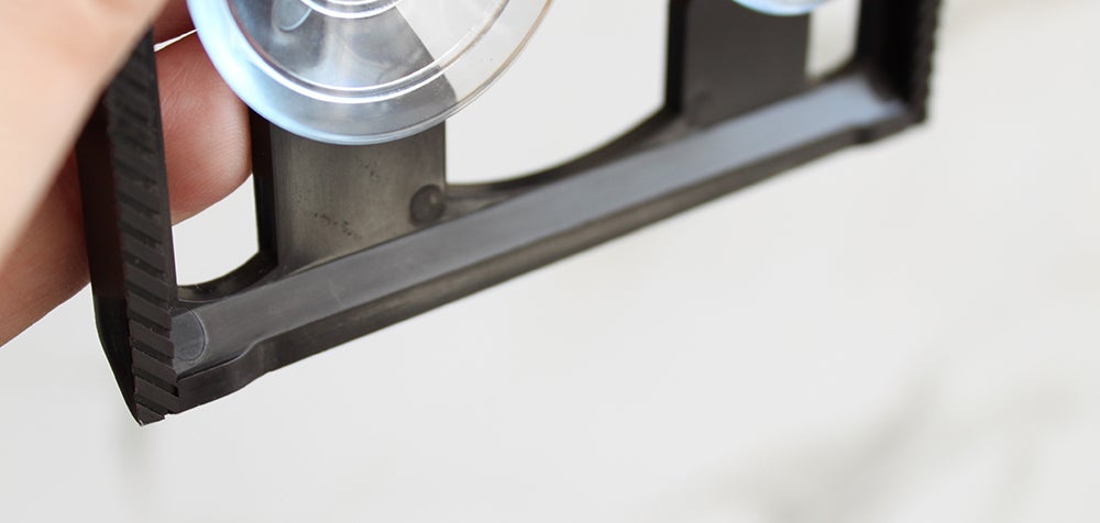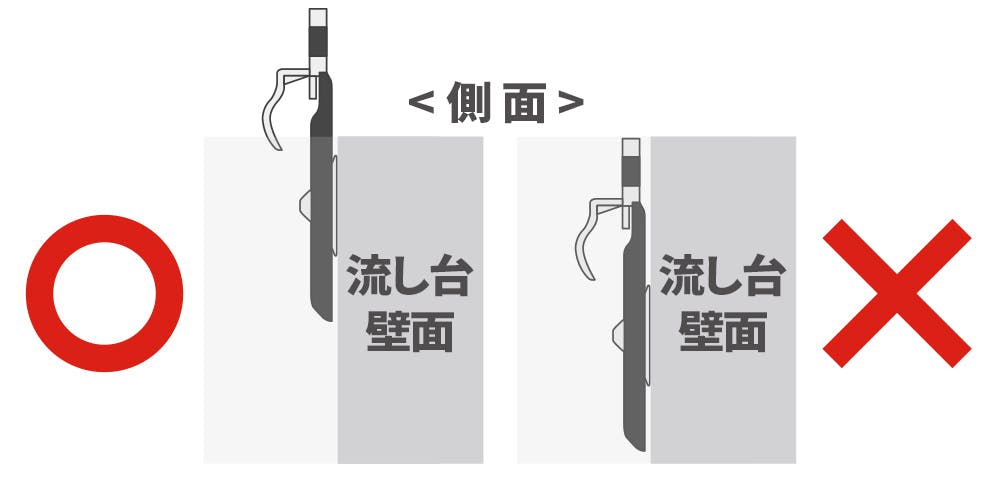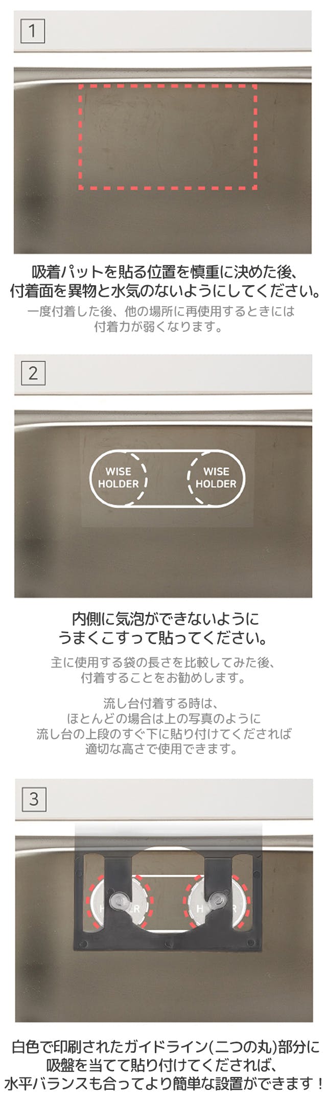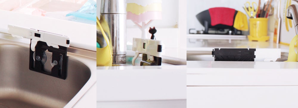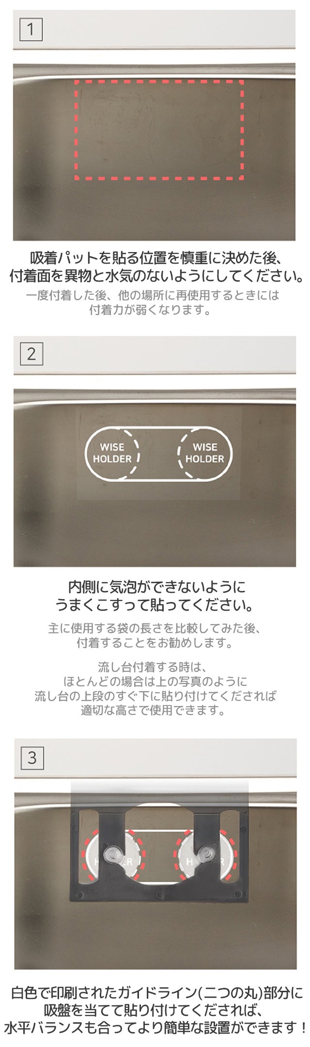 流し台に⽣活の傷がついていたりして、そのせいでうまく吸着ができない場合はパッケージの中に⼊っている吸着パットを⼀緒に使ってください。