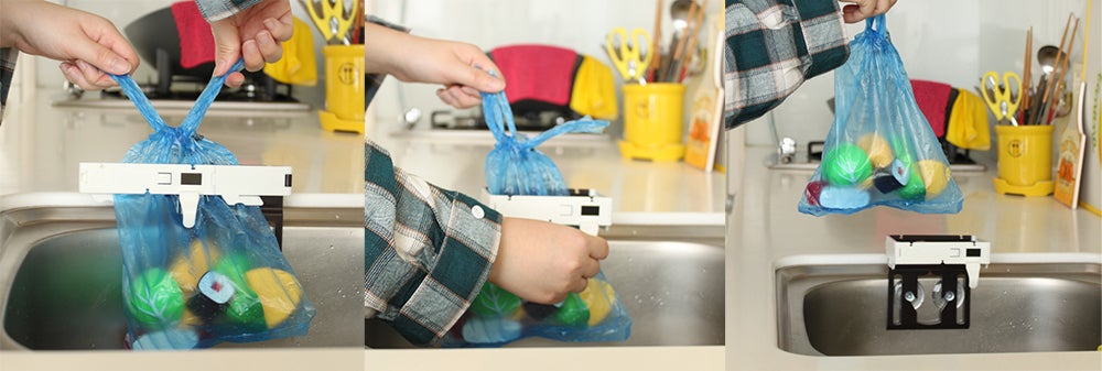 流し台の⾼さを超えるように⾼く設置することも可能で、袋の下がシンクについてしまう折れ曲がることが無いように吸着位置をビニール袋の⻑さに合わせて設置できます。