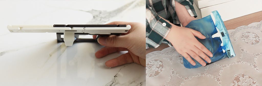 「開けて」、「捨てて」、「閉じれば」終わりです。使⽤者がワイズホルダーを使うとき、掃除のような管理が不要でビニール袋の⼊り⼝だけを固定させて密閉と開閉ができるように設計しました。このような開閉⽅式は「ワイズホルダー」だけの動作原理です。