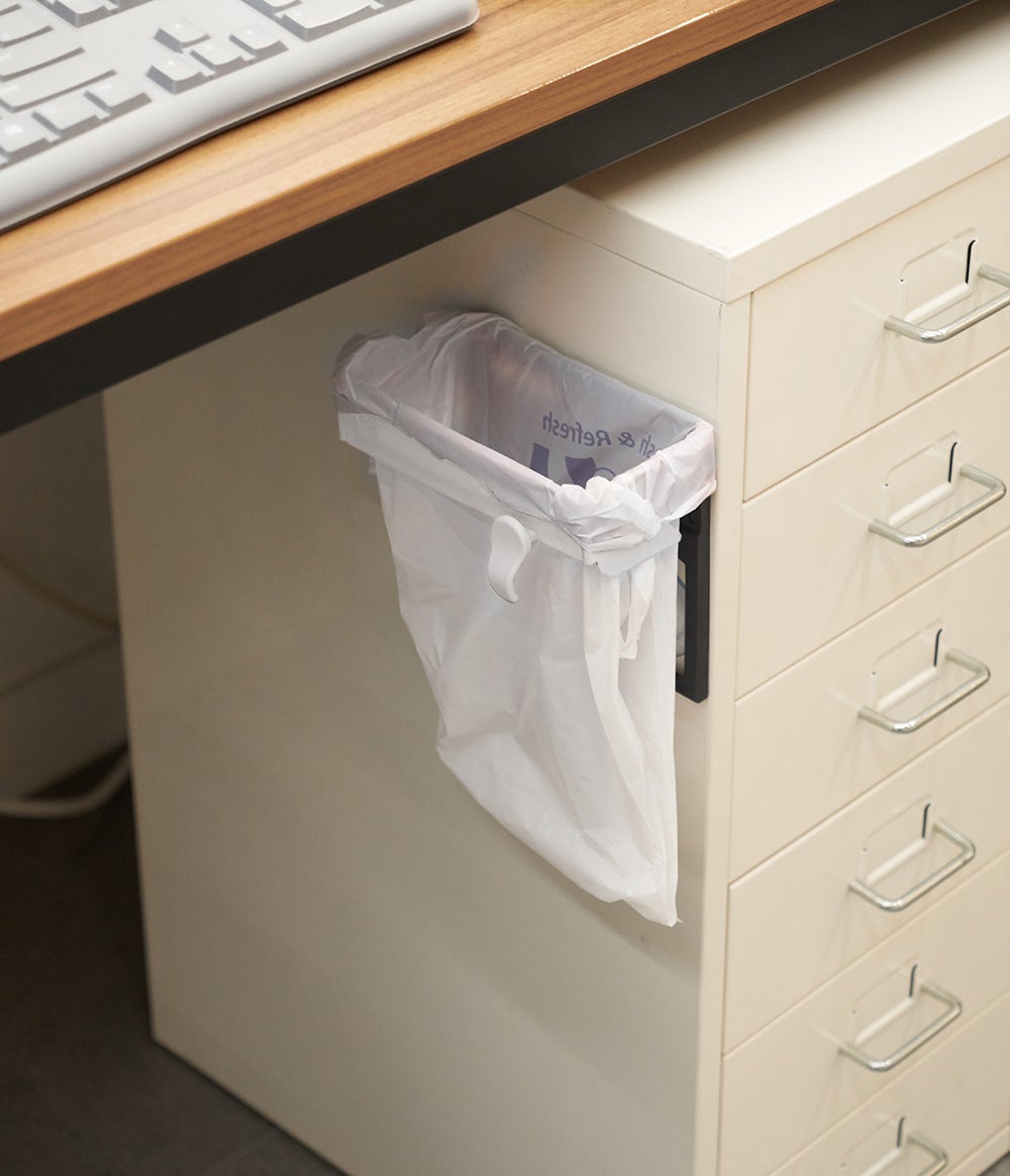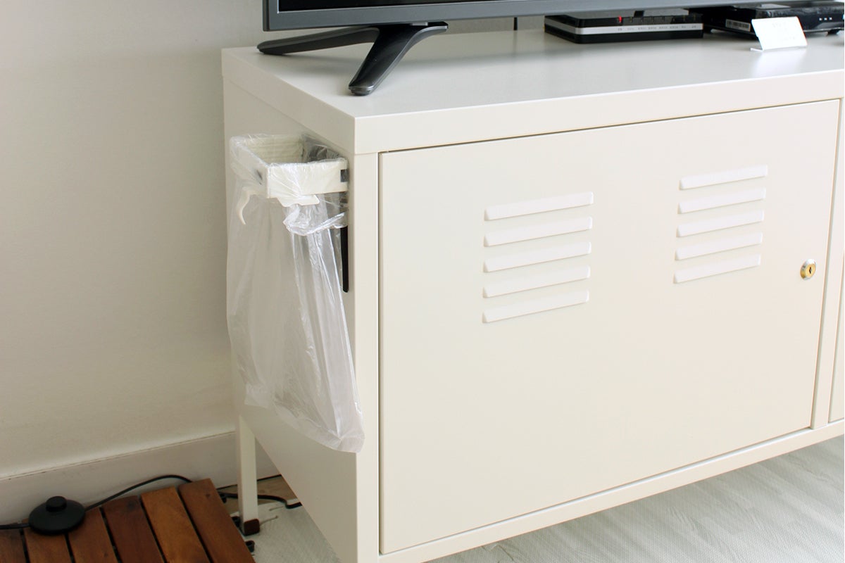 中央の前後ろに袋紐のあるビニール袋をお使いになる時は、中央の「袋紐掛け」に数回ひねった後、挟んでおくときれいに整理されます。