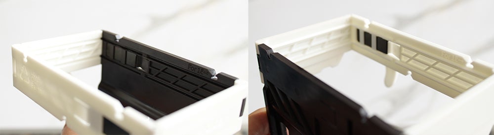 ほとんどの⽣ごみは流し台の中で発⽣します。そしてゴミは発⽣したその場所で処理することが⼀番動線が短くて効率的です。そこで、空間占有を最⼩化させる変形フレーム技術を開発しました。