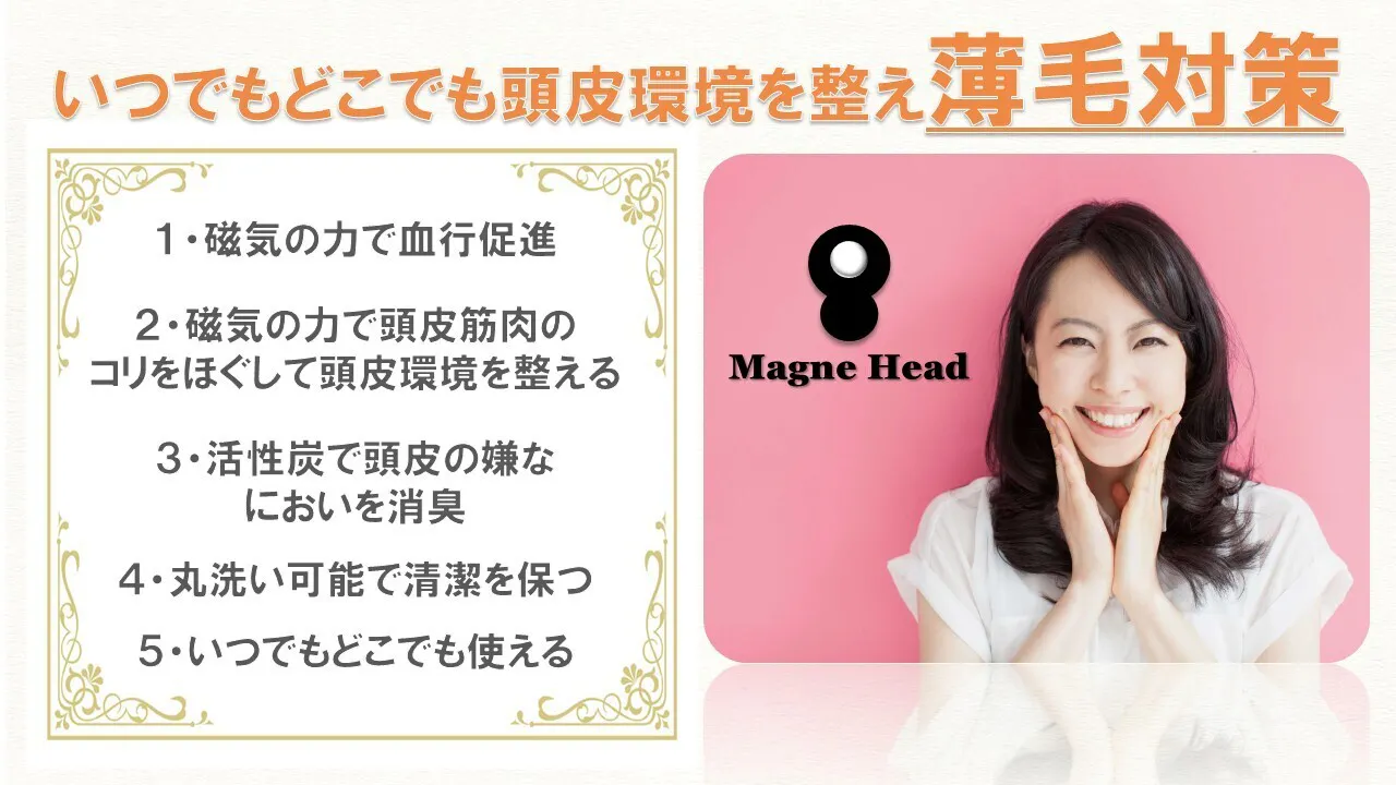 そんな頭皮筋肉のコリをほぐすためにマグネヘッドには人体に悪影響を及ぼさないレベルの磁力で、頭皮環境を改善させます。