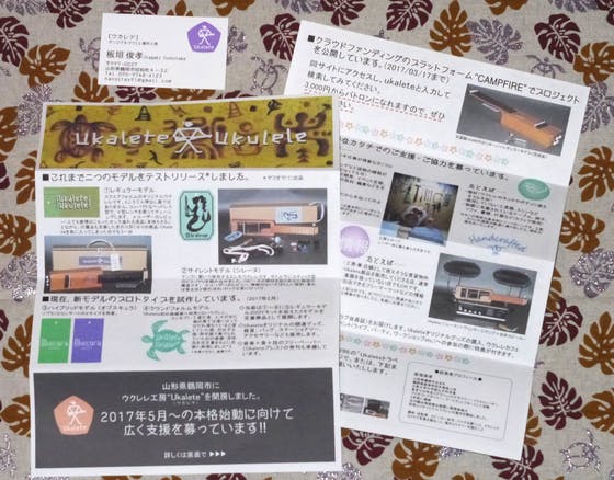 昨年10月に製作に着手。11月に4本完成し、テストリリース(ネットオークションに出品)。その際の商品説明は、"スクエアフォルムのオリジナルウクレレです。ところてん押出し機ではありません……"(以下略) 思った以上に反応が良く、数日で完売しました。落札した方から「とても愛情のこもったセンス溢れる逸品」「本体もさることながら、付属品も充実した至れり尽くせりの商品」「Ukaleteを気に入ってしまったのでもう一台」などのコメントを頂きました。
