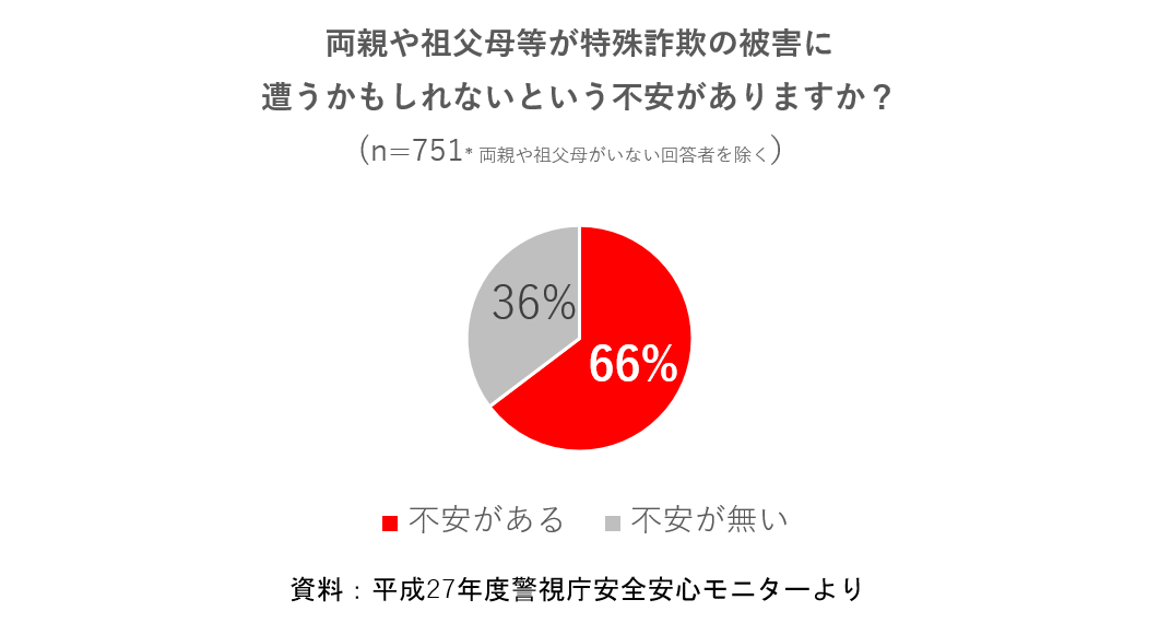 両親や祖父母を持つ人の2/3は、親や祖父母が振り込め詐欺などの特殊被害に遭う不安を感じています。