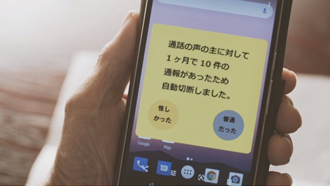 ⇒かかってきた電話の声のパターンを、他の人が「怪しい」と通報した声のパターンとマッチするか判別する仕組みです。マッチした場合、通話を切断した上で、切断した理由を表示させます。