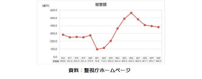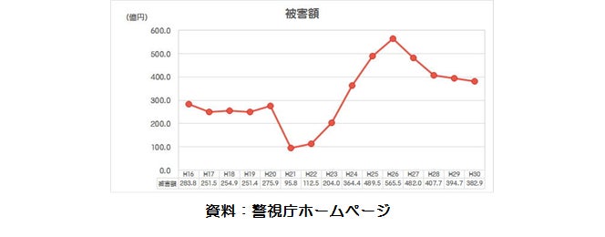 特殊詐欺は、オレオレ詐欺で326万円、架空請求詐欺で446万円、還付金等詐欺で116万円(警察庁「平成28年の犯罪情勢」) と1件当たりの平均被害額がとても高額です。