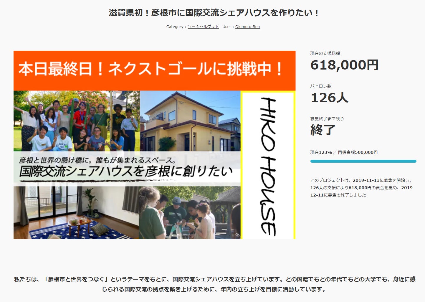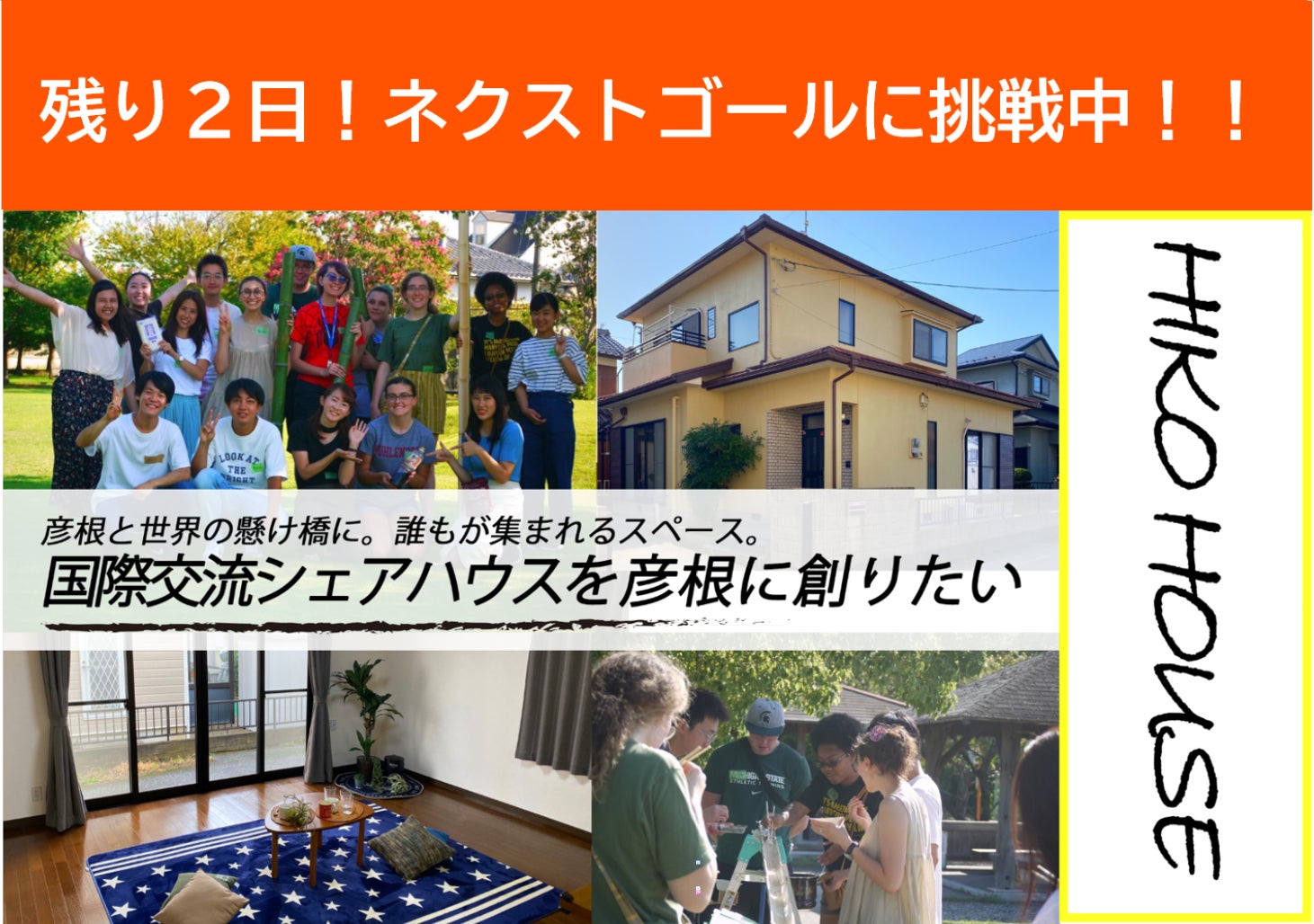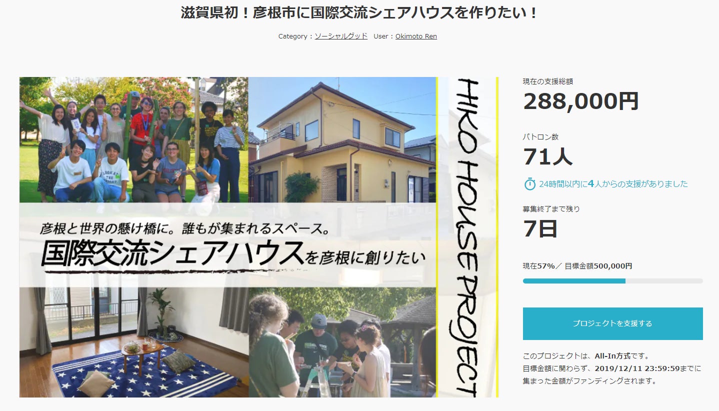 みなさん!!HIKO HOUSEのれんです!ついにクラウドファンディングが終了しましたー!!最終的には!計126人、支援総額 618,000円という結果を収めることができました!めっちゃすごいよね!俺もすごいと思う!!びっくりした!まずは、感謝を伝えたい!1カ月間で、みなさんから支援をもらったり、中にはSNS等で拡散してもらったりした方もいて、本当に感謝の気持ちでいっぱいです。本当にありがとうございました。そして、これでようやく!僕たちのプロジェクトも1つのスタートラインに立てました!!これから、僕たちにはやりたいことがたくさんたくさんあります。僕たちのこれからについて少しお話しすると、彦根や滋賀から世界へ羽ばたく若者、帰ってくる若者、海外から来る若者彼らの存在が、この街を盛り上げる可能性を秘めています!そんな可能性を最大限に発揮できる拠点となるように、これからもどんどん盛り上げていきますよ!どうかこれからも、僕たちの活動を応援してください!一緒にいろいろやりましょう!そして、このプロジェクトの立ち上げメンバーとして関わってくれている仲間たちは1月11日のオープニングパーティーを最後に締めくくりとなります。それ以降にも継続して関わってくれる人もいれば、来年の就職に向けて準備をする人や、別の地域で価値のあるプロジェクトを生み出す人など、さまざまです。僕はそれでいいと思っています。そんな風に、このシェアハウスを機にいろんな世界へと飛び立っていく若者が増えたらいいなという想いがあります。これからも、新しいメンバーがどんどん加わったり、あるイベントだけの運営メンバーとして関わってくれたりすると思います。そんな一時的な関わりが、今の若者には合ってると思うし、認めてあげられる街になってほしいとも思っています。そんなエモいこともちょっとずつ言いながらも楽しく、街を盛り上げられるプロジェクトをどんどん生み出していきますので!これからもどうぞよろしくお願いしまーす!!ここからも近況報告やメンバー紹介の残りなども少しずつやっていきますねー!HIKO HOUSE れん公式ホームページhttps://sites.google.com/view/hiko-house/hom沖本怜ブログhttps://note.com/00_11