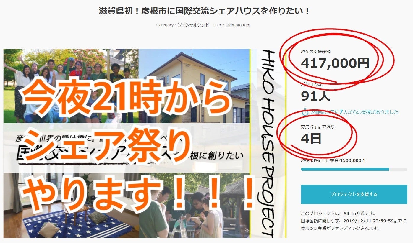 みなさん!れんです!クラウドファンディングが残り6日になろうというときに!目標金額50%を突破しましたー!!いぇいいぇい!ご支援いただいた皆さんには本当にしてもしきれないです!この投稿をどれだけの方が見てくれているかわかりませんが見てくれていると信じて、僕の心にある想いをお伝えします。このプロジェクトを始めた当初は「彦根にこんなのがあったらいいなぁ」くらいにしか思ってませんでした。でも、彦根や滋賀県で「社会をもっと良くしたい!!」と活動している大人や学生にたくさん出会っていくうちに僕の目線は、彦根の学生のために、彦根のために、滋賀県のために、、、と徐々に大きくなっていき、いつのまにか若者(学生)とよそ者(留学生)とばか者(れん)から「滋賀県を変革するプロジェクト」という認識でがんばろう!と奮起しています。それもこれも、支えてくれるみなさん、自信をくれるみなさんのおかげです。綺麗ごとだけではなく、マジで。だからこそ、残り7日で必ずこのクラウドファンディングを達成させます!絶対絶対!何が何でも絶対!もし余裕のある方は、FacebookやInstagramでコメント付きでシェアをして頂けるとうれしいです!別にコメントがなくてもいいです!興味ある方に直接お伝えいただくとかも、すっごくうれしいです!みなさんと一緒に「達成したね!!」と喜び合えるクリスマスを目指して。HIKO HOUSE れん公式ホームページhttps://sites.google.com/view/hiko-house/hom沖本怜ブログhttps://note.com/00_11